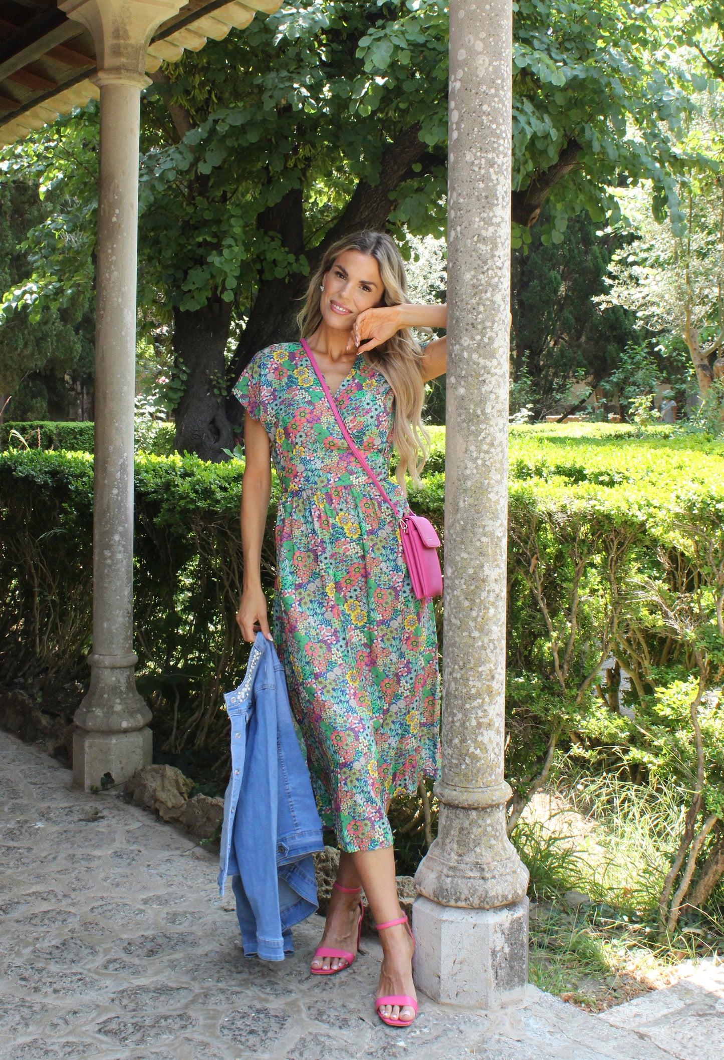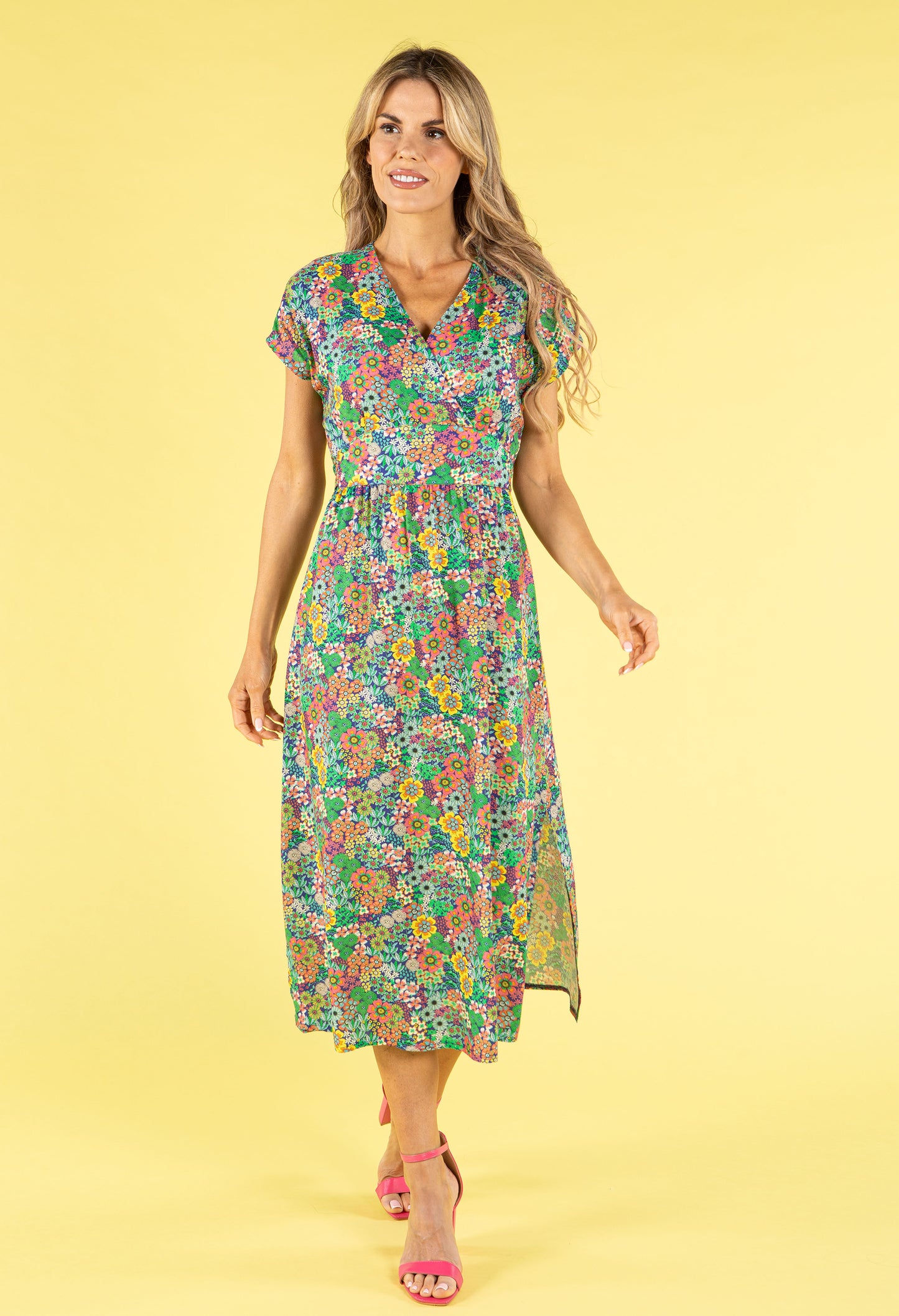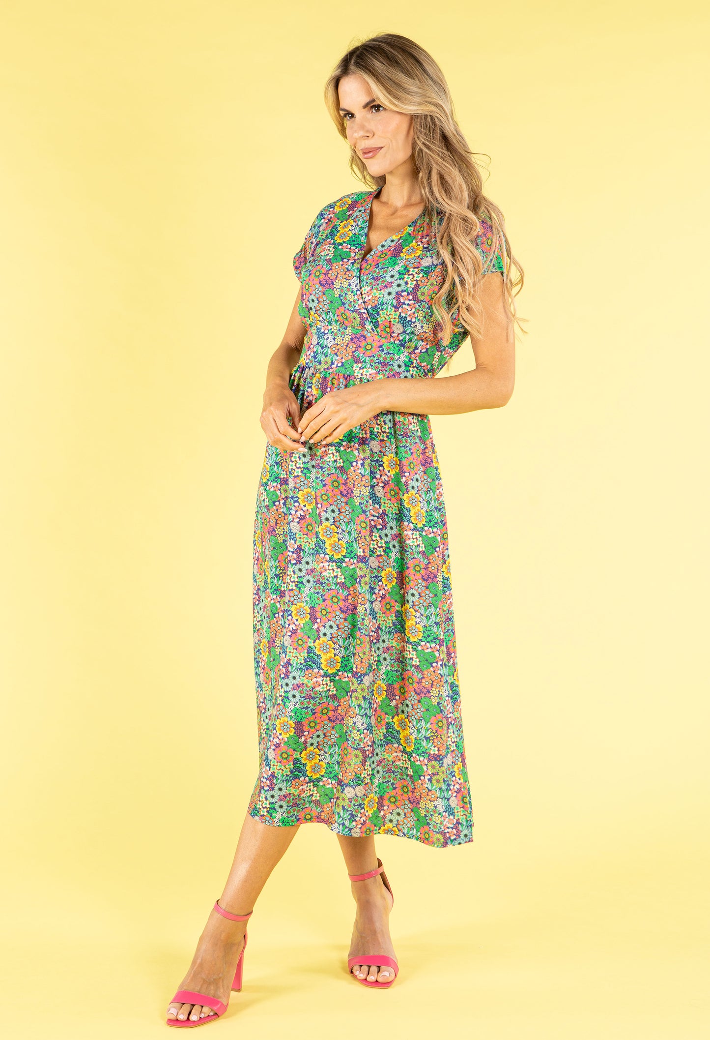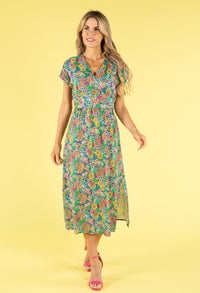 Step into effortless elegance with this stunning midi dress, designed with a tied waist and flattering v-neck. The angel sleeves and belted waist create a feminine silhouette, while the soft floral print adds a romantic touch. Ideal for summer occasions, this dress is a timeless addition to your wardrobe.