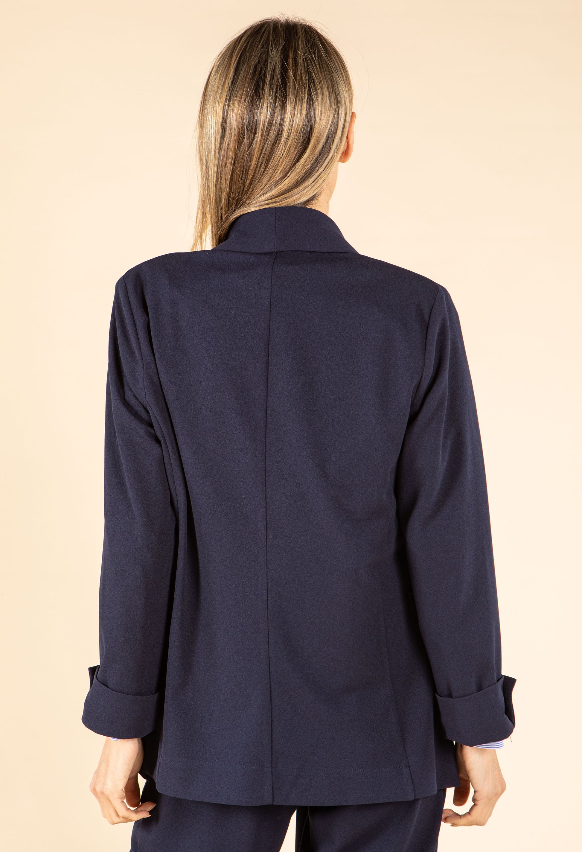 This elegant single-breasted blazer features stylish faux front pockets, chic 3/4 length rolled sleeves, structured shoulder pads, and eye-catching gold button accents for a refined look.