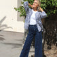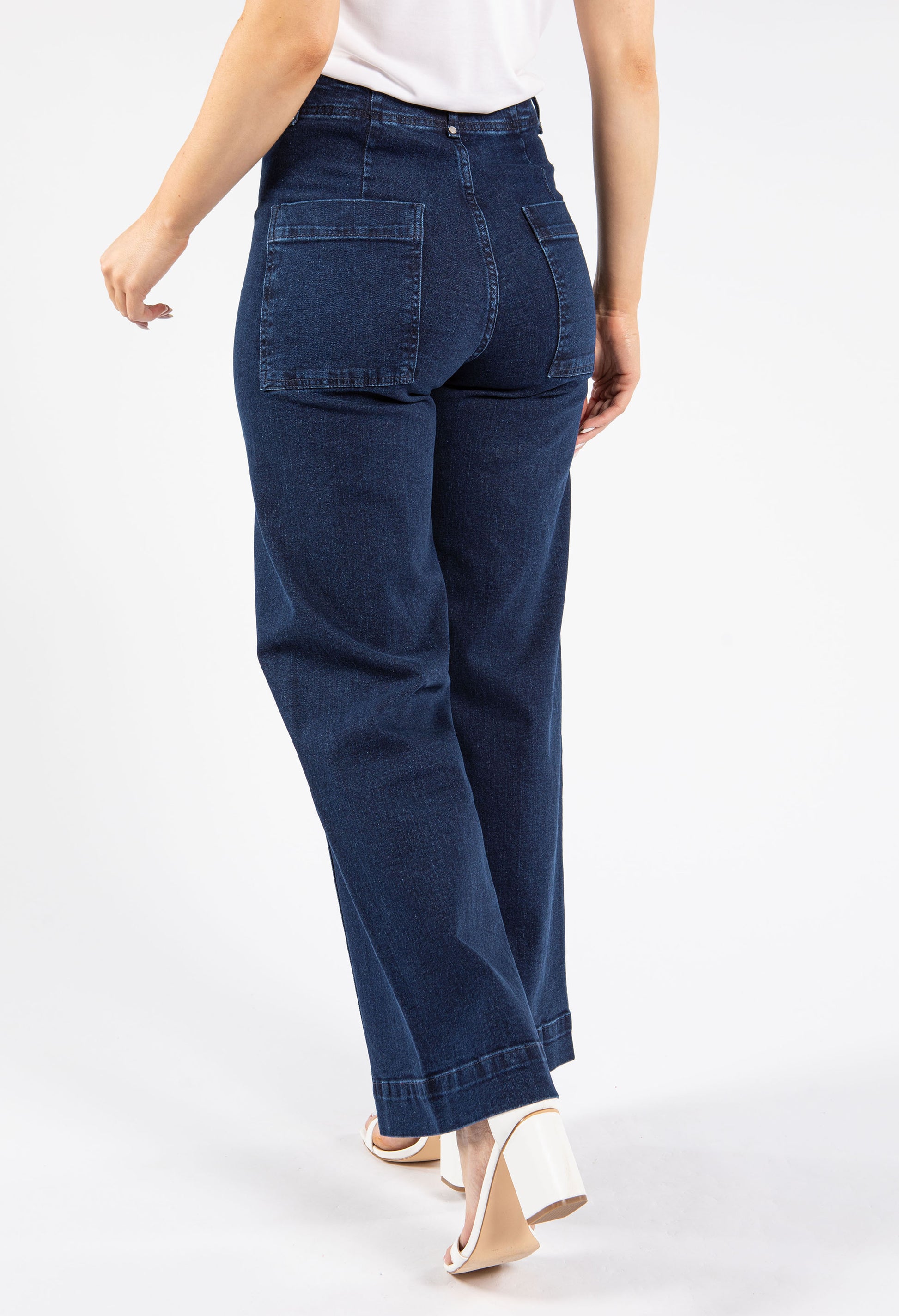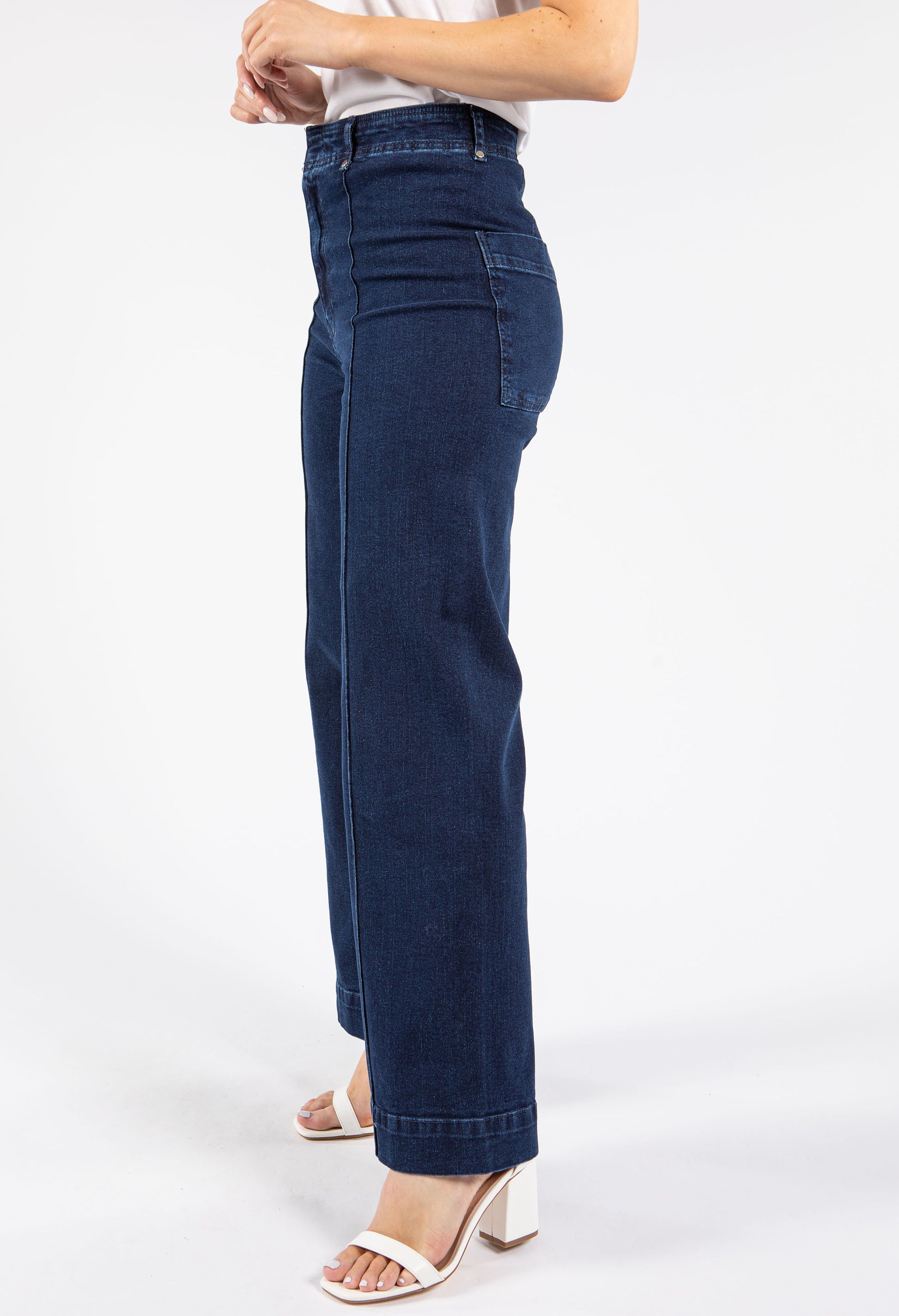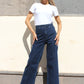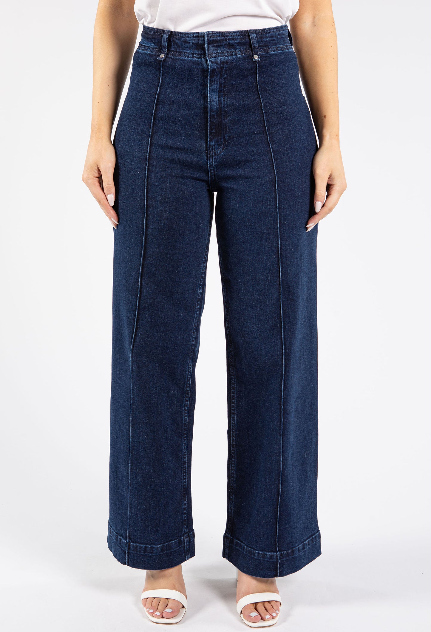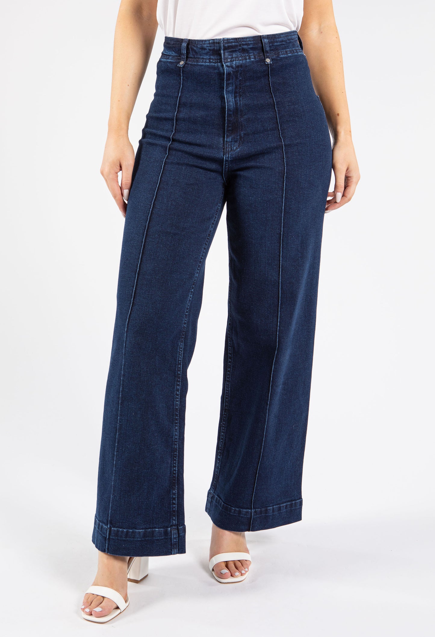 A high waisted tailored dark indigo stretch mix denim, with clean lines - the ultimate versatile staple for heels, wedges, or sneakers.