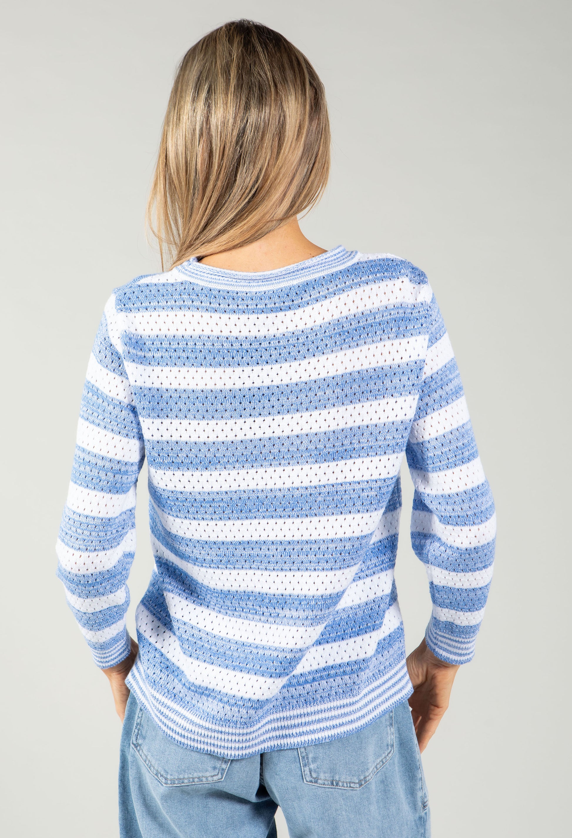 This relaxed-fit jumper combines comfort with contemporary style, featuring soft-touch fabric and a timeless round neckline. The three-quarter length sleeves showcase subtle cut-out detailing, while ribbed cuffs and hemline provide a neat, finished look. Perfect for layering, it's an easy essential for your everyday collection.