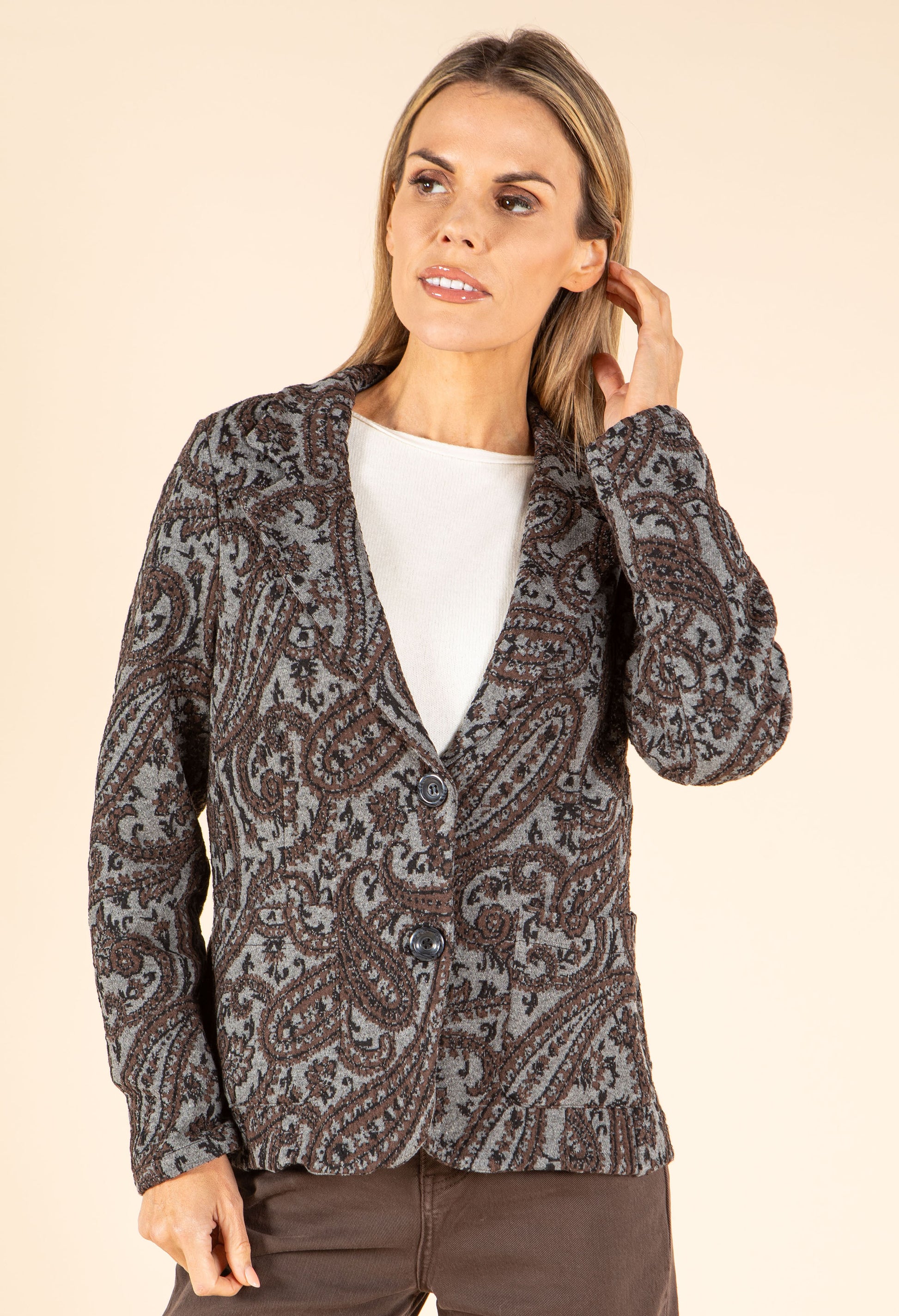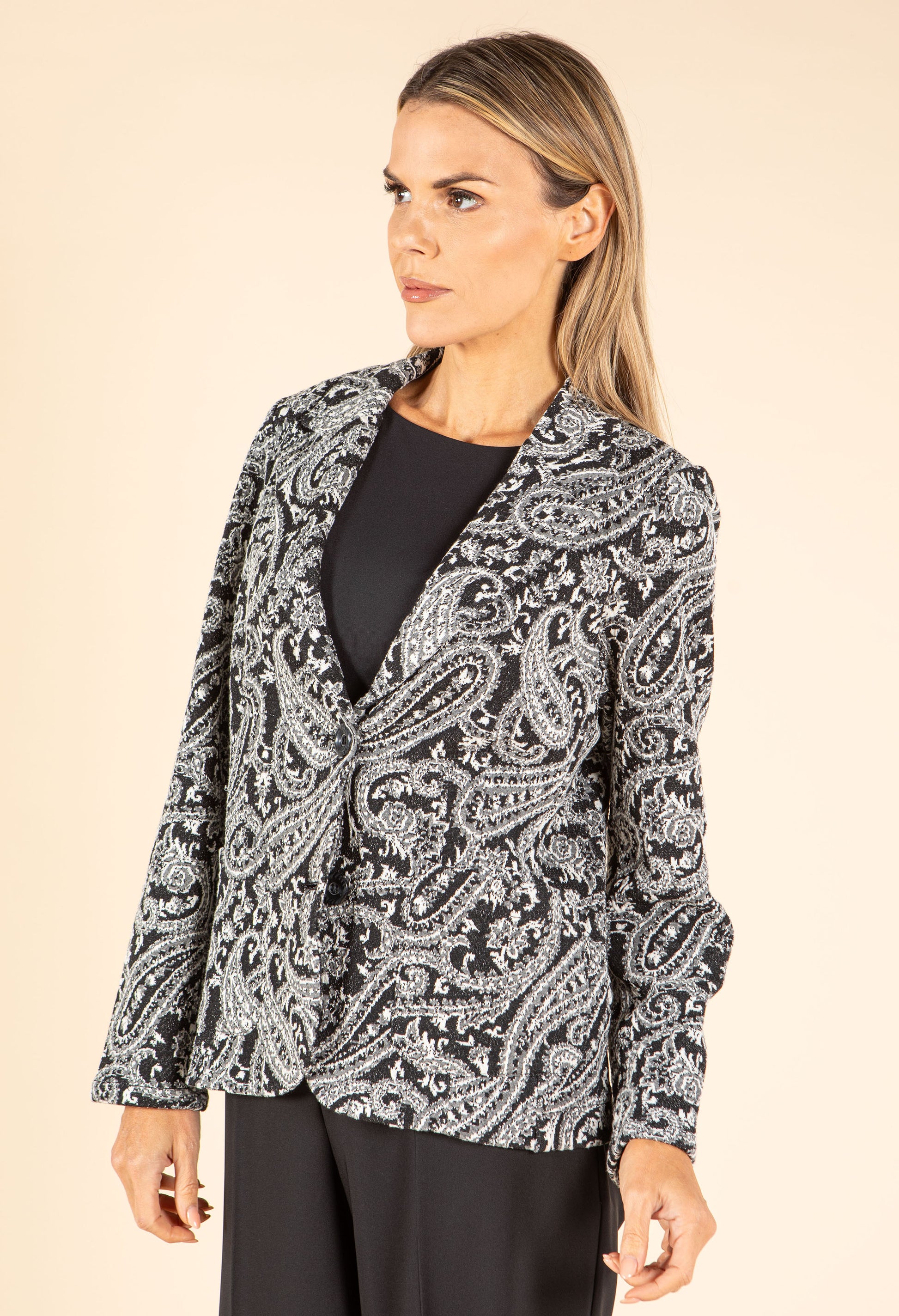 This single-breasted blazer features notch lapels and long sleeves, finished with a button closure and front patch pockets. Crafted from stretch jacquard fabric, it showcases a striking paisley pattern that adds a stylish edge to your look.