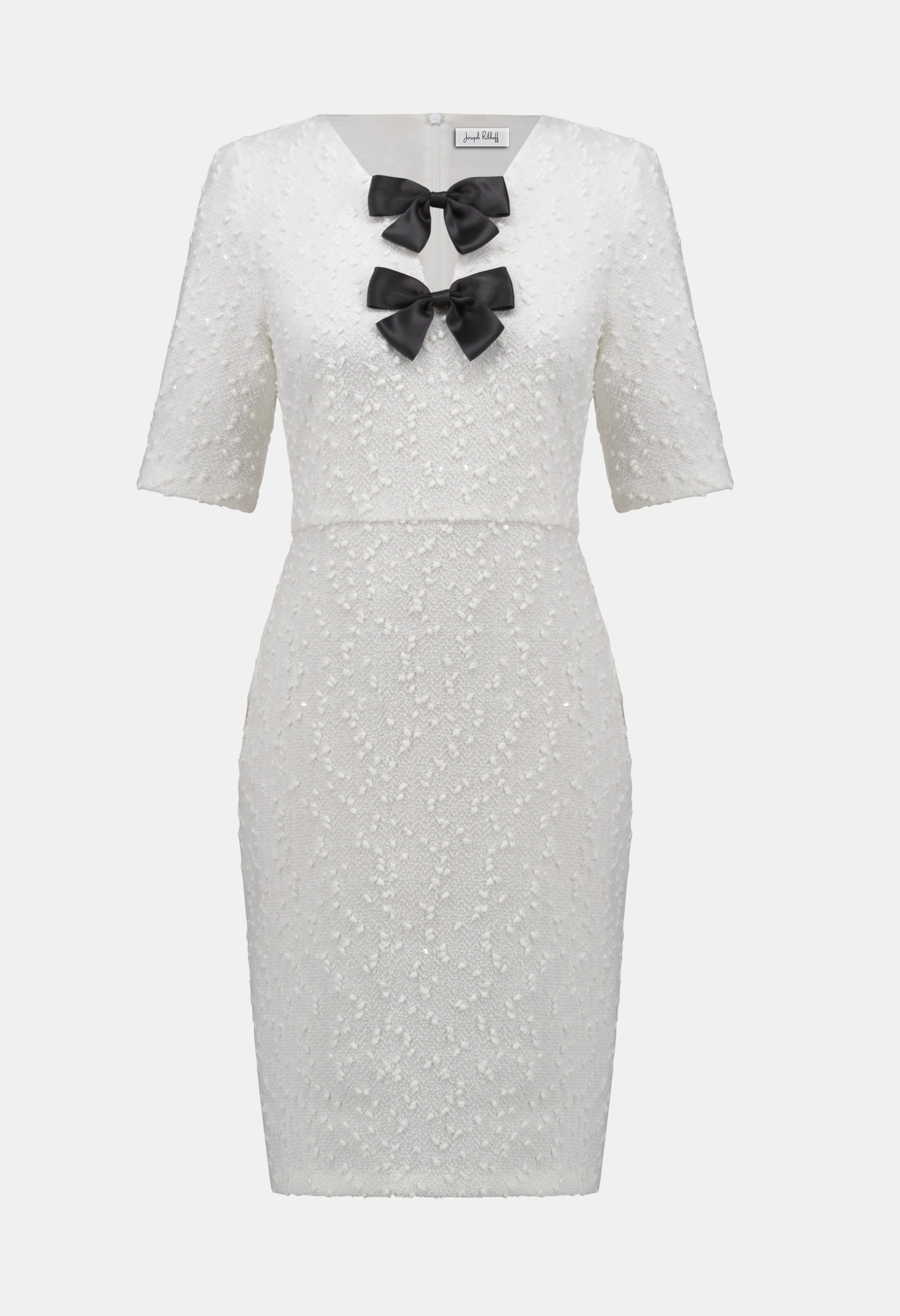 Introducing the Joseph Ribkoff knee-length bodycon dress, a perfect blend of elegance and sophistication. This plain, short-sleeve dress features a round-neck design, enhanced with exquisite jewel embellishments and a charming bow detail. Ideal for both formal and semi-formal occasions, its feminine style and straight-sleeve cut ensure a flattering fit that exudes confidence and grace.