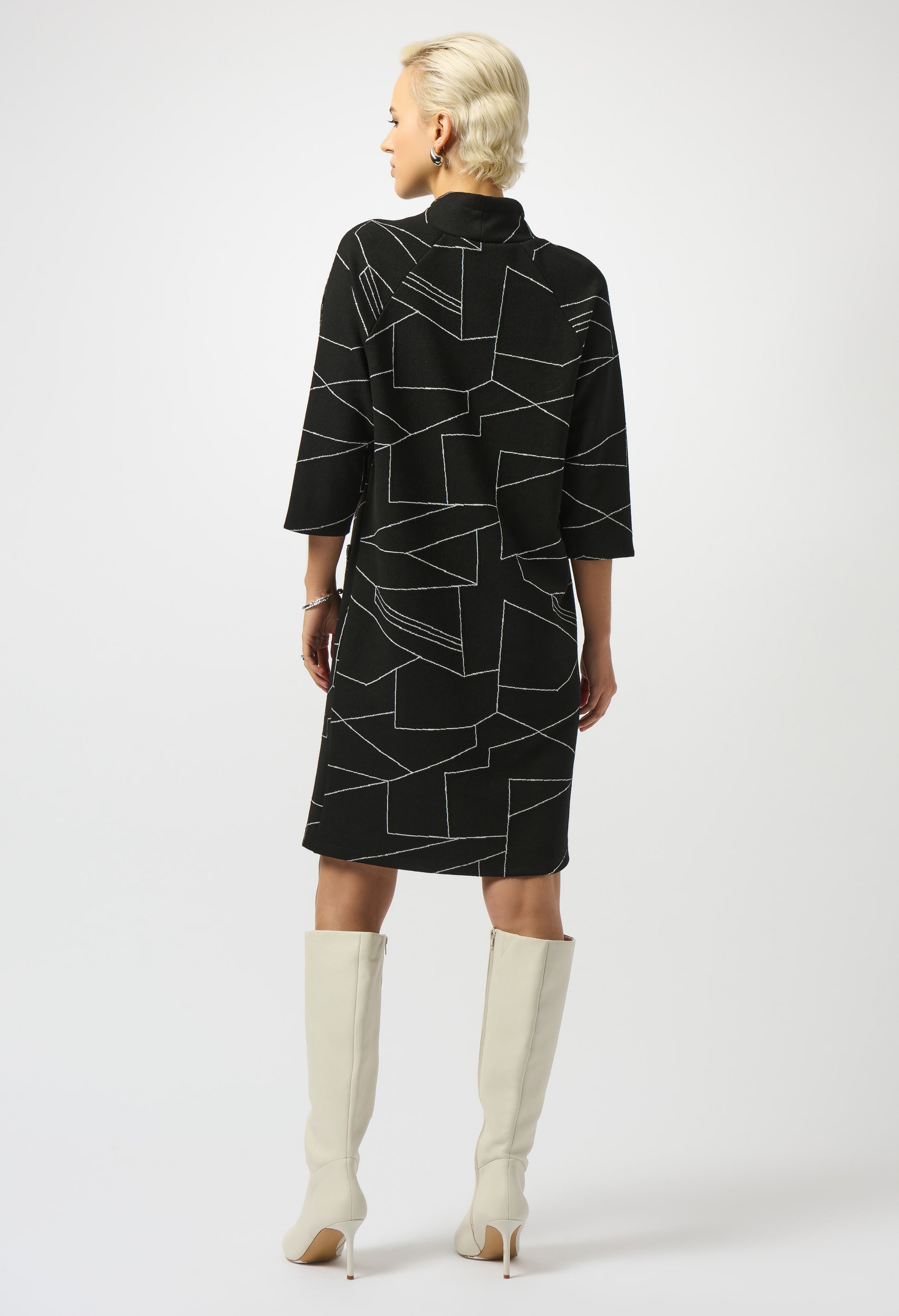 Introducing the knee-length shift dress by Joseph Ribkoff, perfect for both casual and office settings. This minimalist piece features a collared neckline and straight, 3/4 sleeves, offering a chic and sophisticated look. The geometric pattern and belted waist add a touch of modern flair, while practical pockets enhance its functionality. Embrace effortless style with this versatile dress.