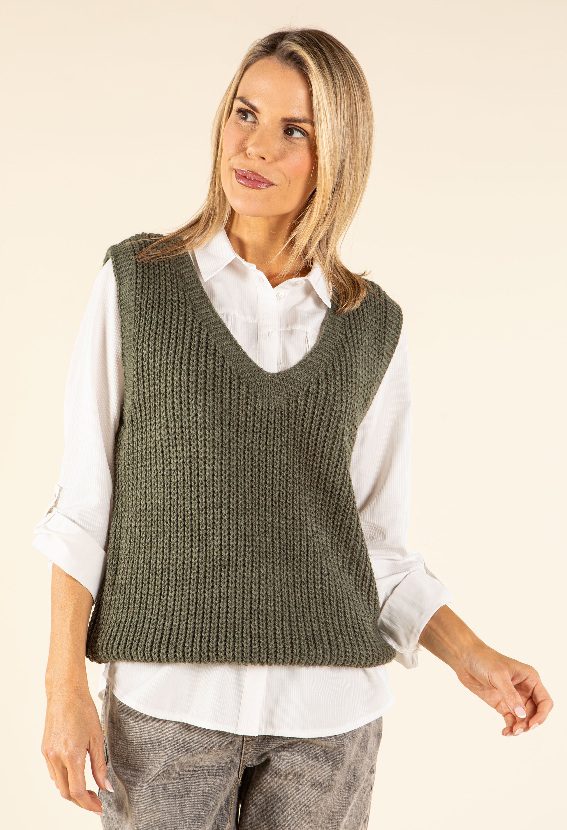 This refined knit vest is crafted from a wool blend with a soft texture, featuring a sleeveless silhouette and a V-neckline. It comes in a free size that comfortably fits sizes 10 to 14.