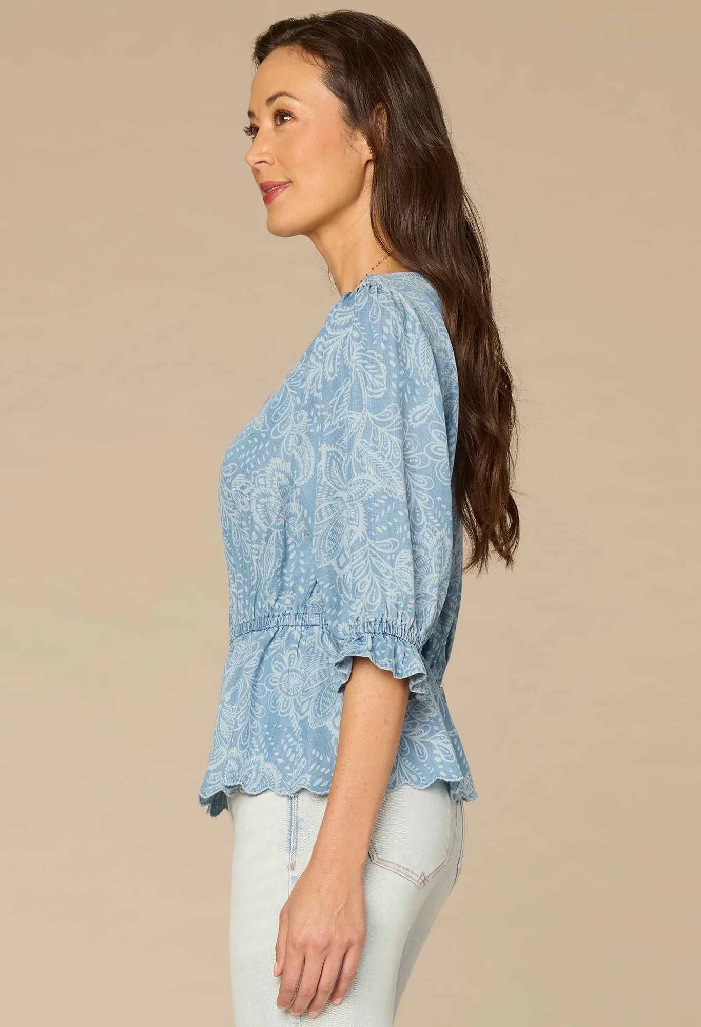 On-trend and elevated, this woven top features below elbow lantern sleeves, a scallop V-neck, and a flattering peplum scallop hem. Its soft abstract floral print adds a feminine touch.