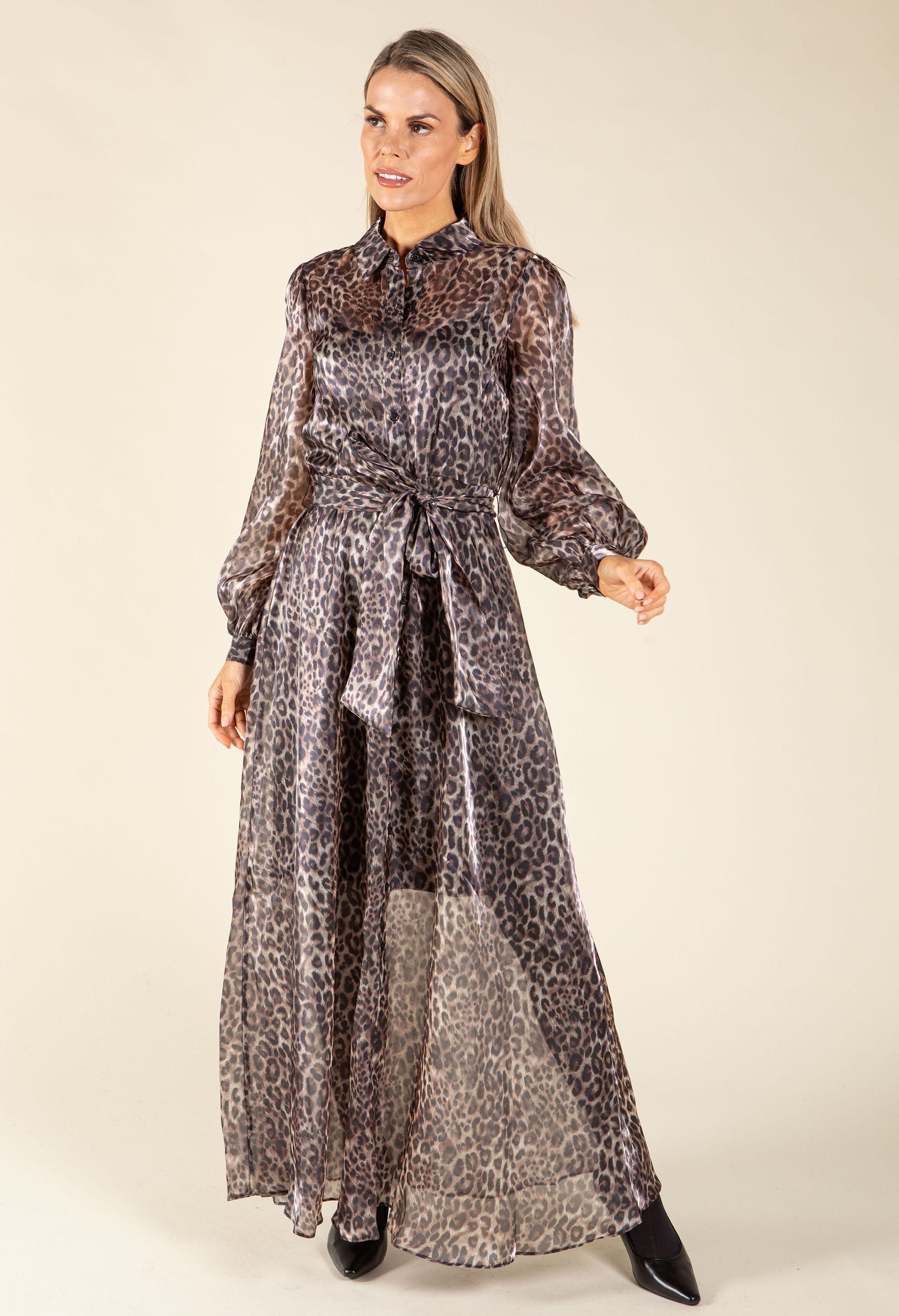 Crafted from sheer fabric, this maxi shirt dress features a button-down front, long sleeves, and a classic collar. It includes a tie waistband to highlight your silhouette and showcases a bold leopard print for a striking, fashionable statement.