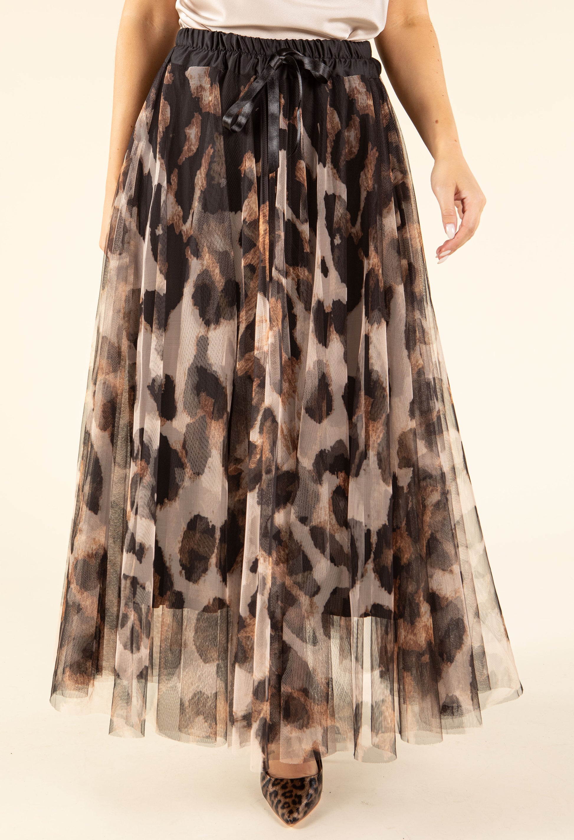 This sophisticated midi skirt features a flowing silhouette crafted from tulle with a leopard print design. It includes a satin elasticated waistband, a delicate bow detail, and is fully lined. The free size fits comfortably from sizes 8 to 14.