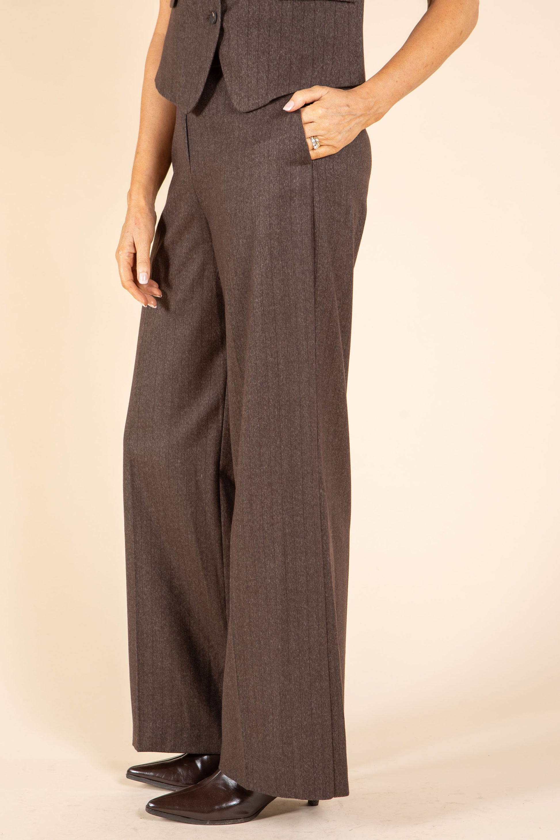 Elevate your everyday style with these pinstripe trousers, featuring a wide straight leg for a flattering fit. Designed with a button and zip closure, side pockets, and a faux back pocket, they bring effortless polish to any outfit.