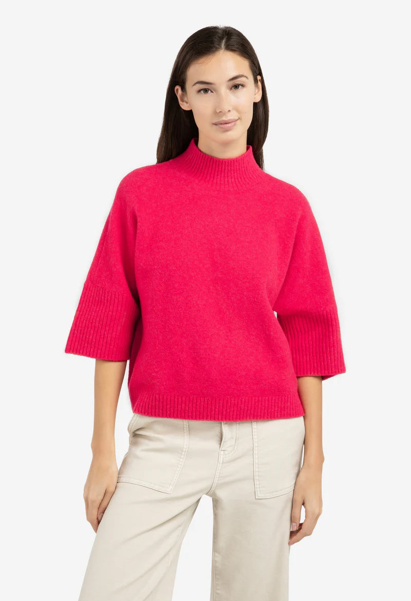 This comfortable sweater features a loose fit, a ribbed mock neck and three-quarter sleeves with wide ribbed cuffs. Made from a soft knit fabric that feels warm against the skin. The minimalistic design and clean finish make it a versatile piece. A stylish addition to your everyday wardrobe for a refined, casual look.