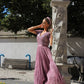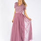 Maya lotus pink V-neck full length tulle skirt dress with delicate sequins top and satin belt.