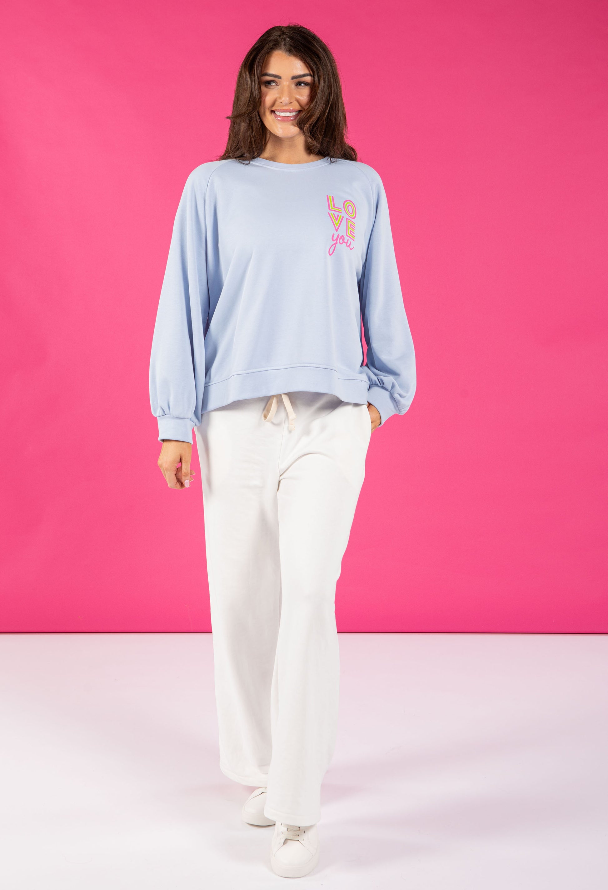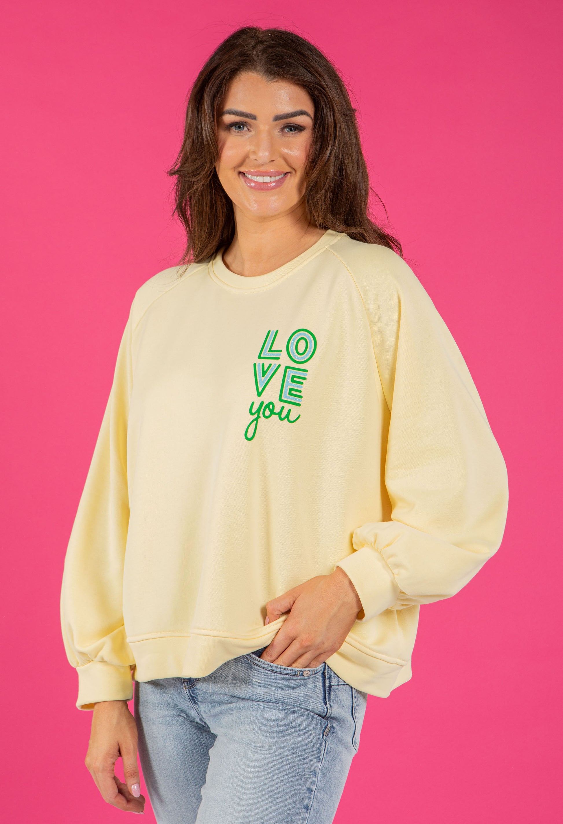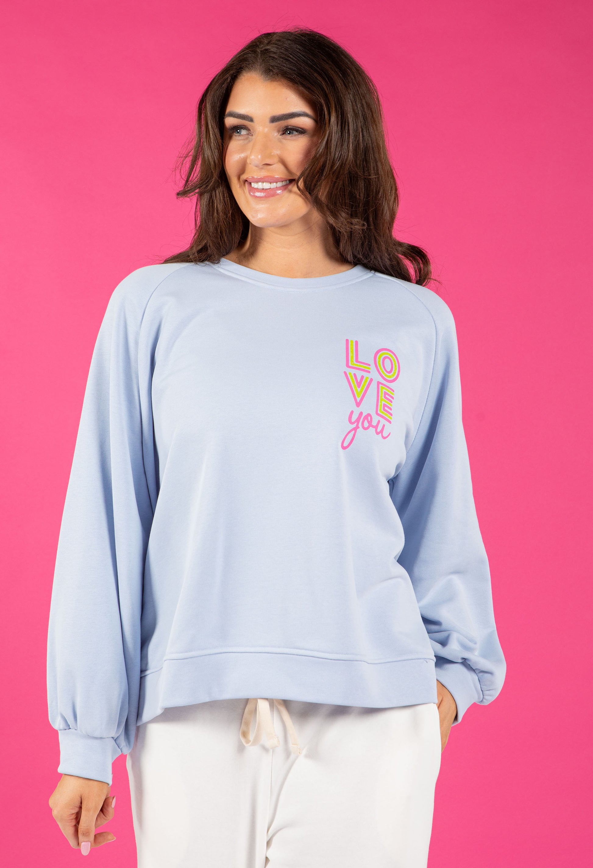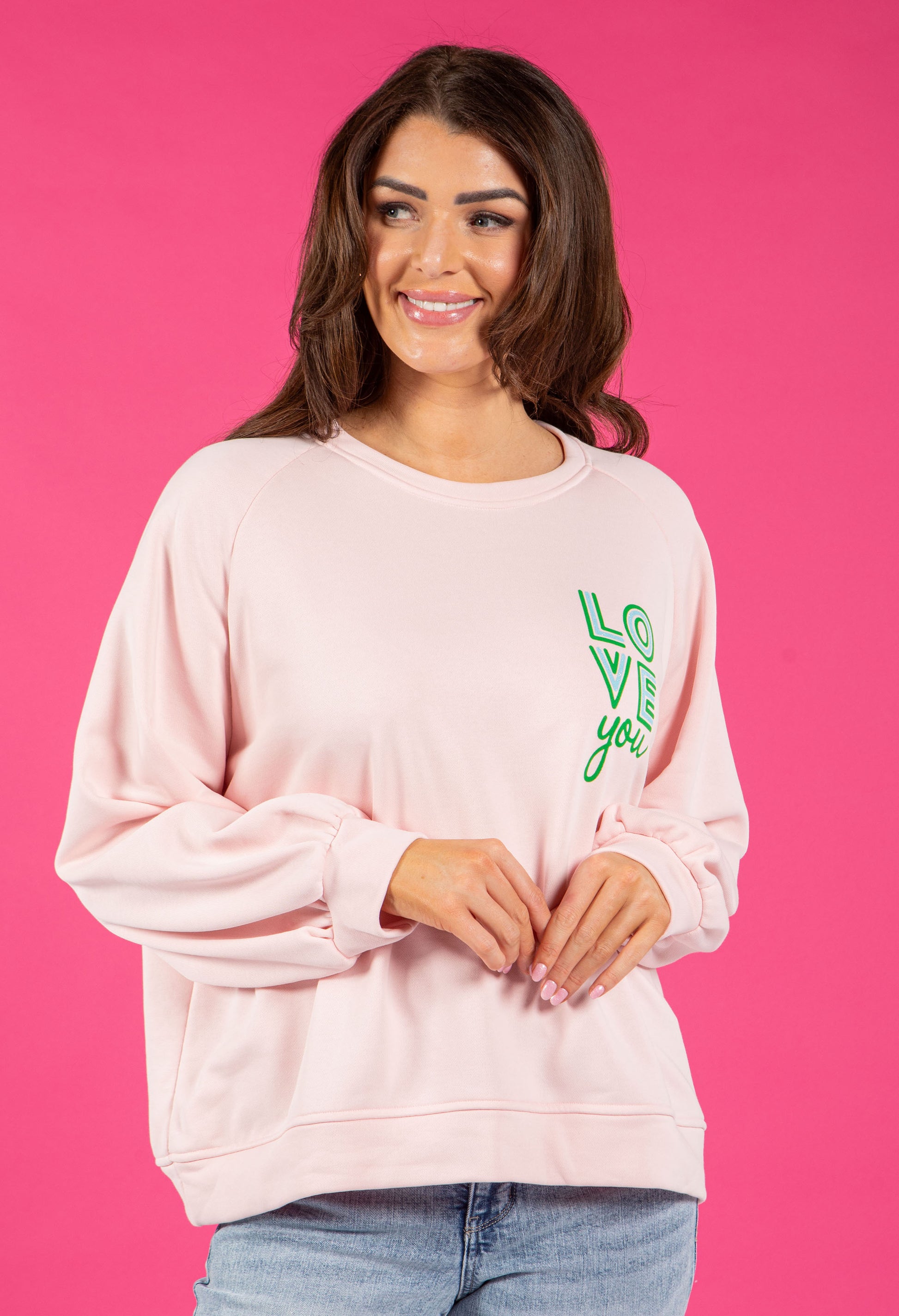 Spread the love with this charming relaxed-fit jumper that sparkles with personality. Featuring a round neckline and long sleeves in beautifully soft fabric, it showcases "Love" printed details enhanced with eye-catching glitter embellishments.