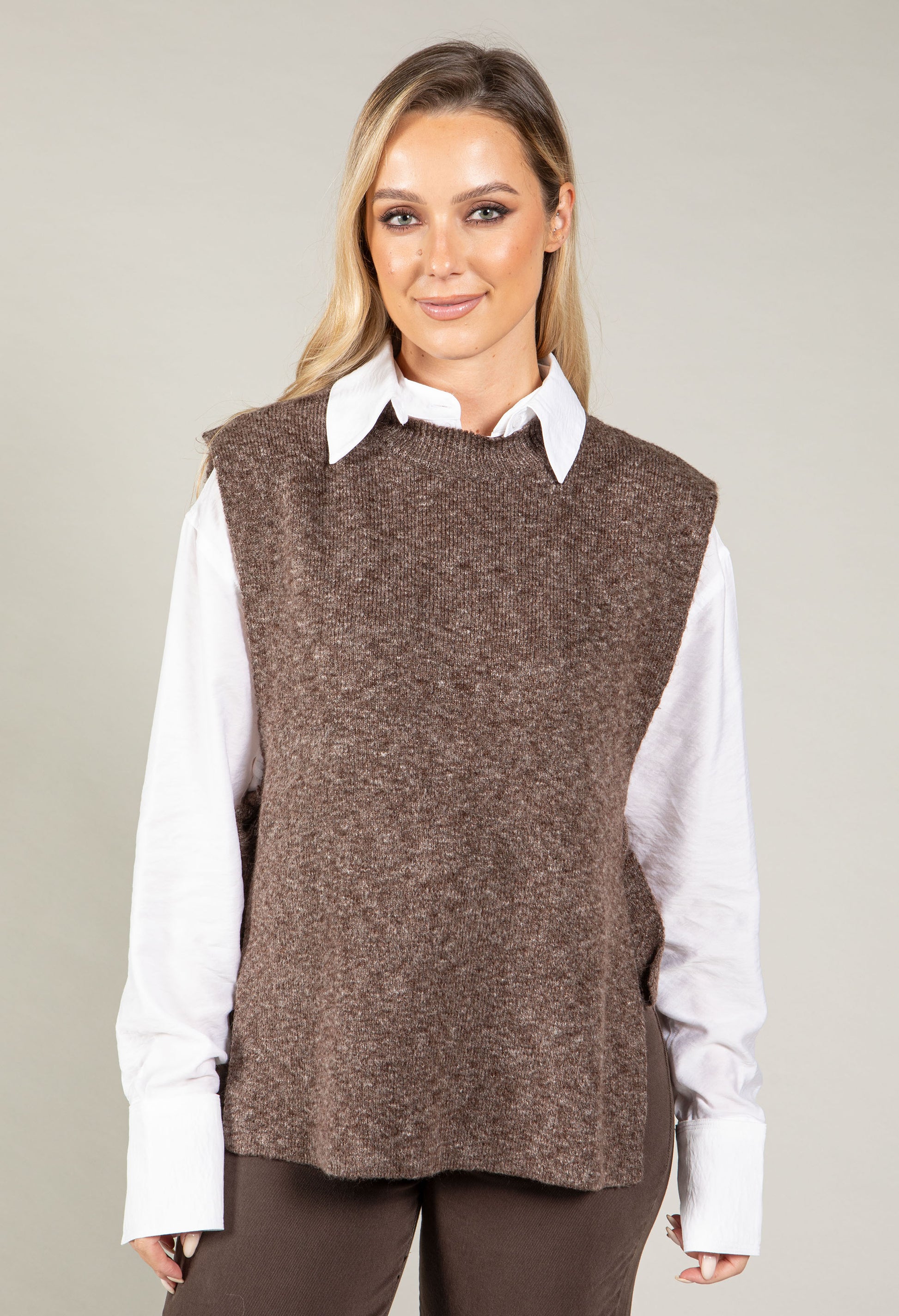This sleeveless knitted vest features a soft-touch fabric with a round neckline and ribbed trim, enhanced by an adjustable side tie closure for a perfect fit.