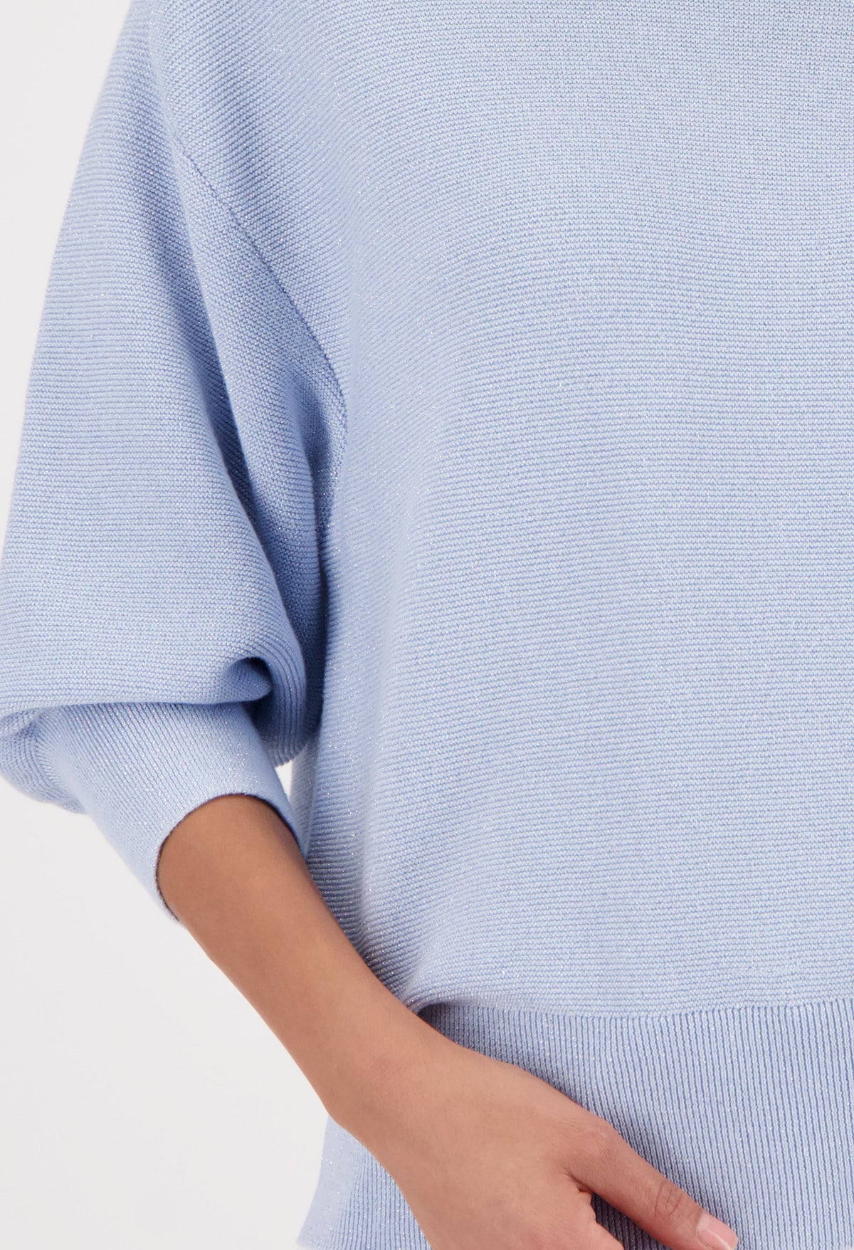 Elegant knitted sweater made of high-quality cotton with shiny lurex, rounded neckline, and wide ribbed hem for stylish looks.