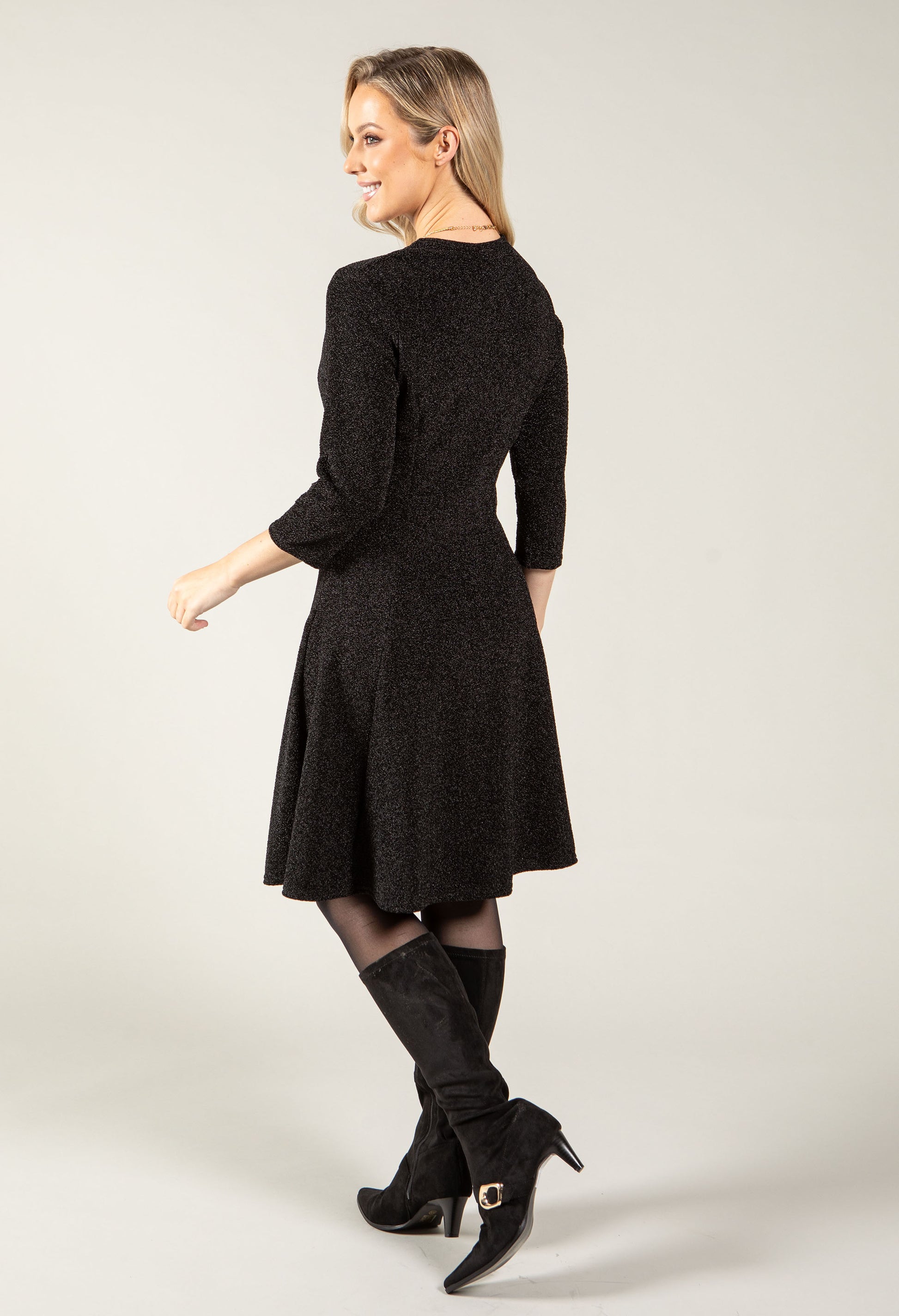 Turn heads in this elegant Lyon dress, featuring a distinctive scalloped V-neckline that adds a refined touch. The three-quarter length sleeves provide versatile coverage, while the knee-length cut offers a timeless silhouette that flatters all figures. Crafted from stretch material with a sparkling finish, this dress transitions effortlessly from day occasions to evening events.