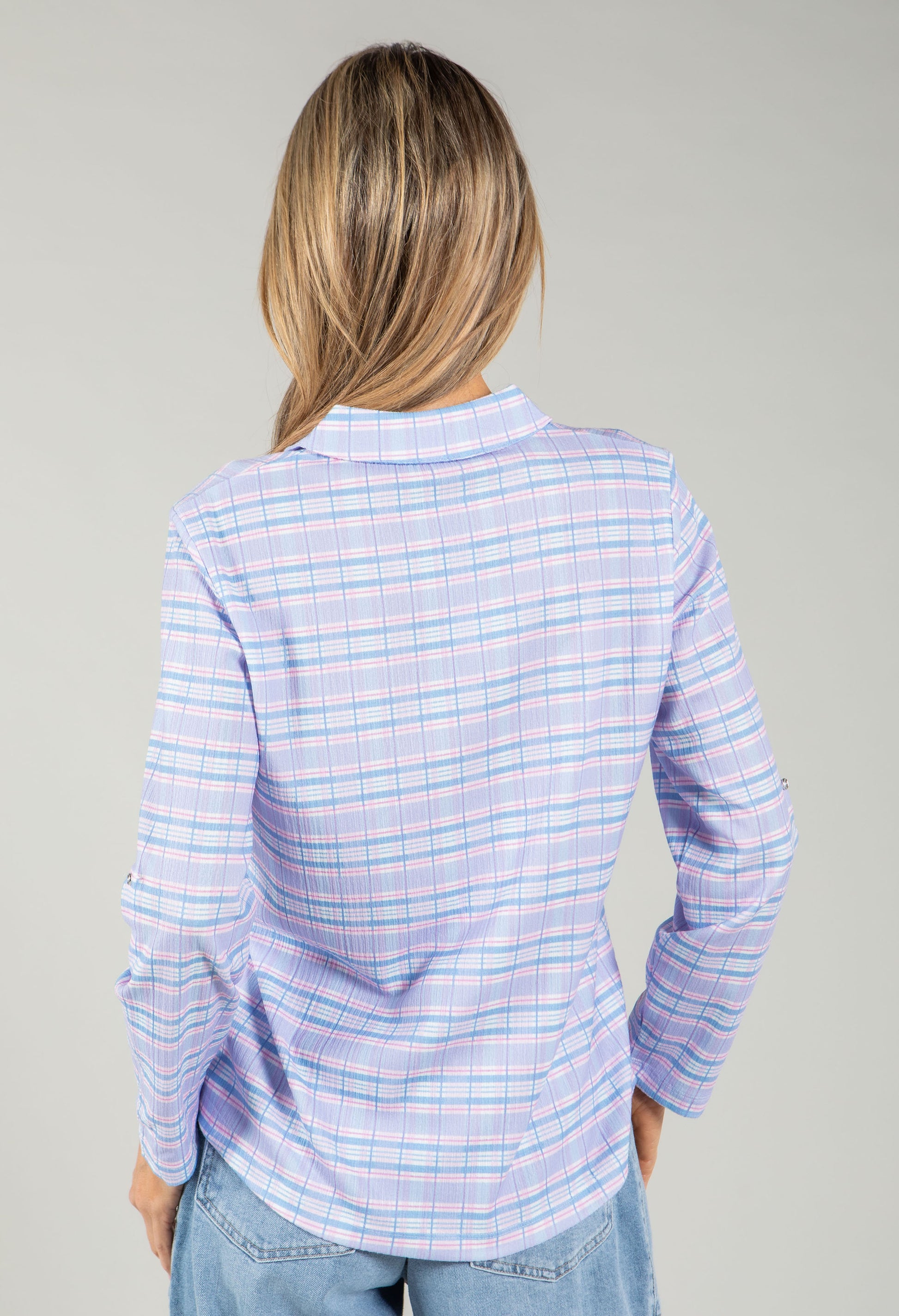 Elevate your wardrobe with this charming check blouse, featuring a soft-touch fabric that feels as good as it looks. The classic V-neckline and collar create a refined silhouette, while rolled-up sleeves with buttoned cuffs add a relaxed, contemporary edge. Practical front patch pockets and a faux button closure complete this versatile piece that transitions seamlessly from casual to smart.