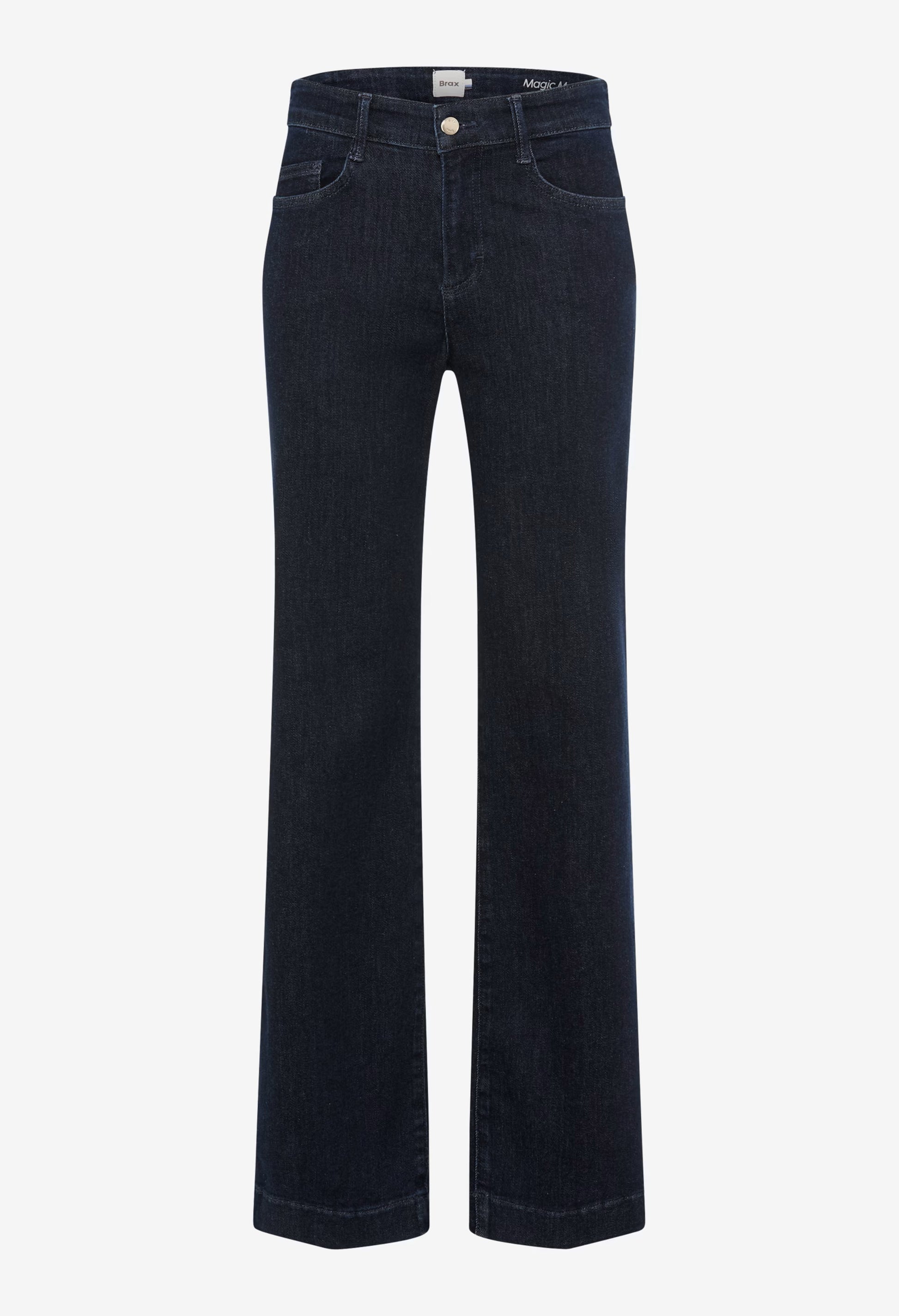 These five-pocket jeans showcase a wide-leg silhouette with a concealed zipper. They feature patch pockets at the back and a coin pocket, with an inside leg length of 82 cm and a foot width of 54 cm, combining comfort with elegant design.