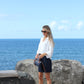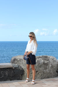 Lifestyle Image- Navy: Blouse, Sandals, Sunglasses