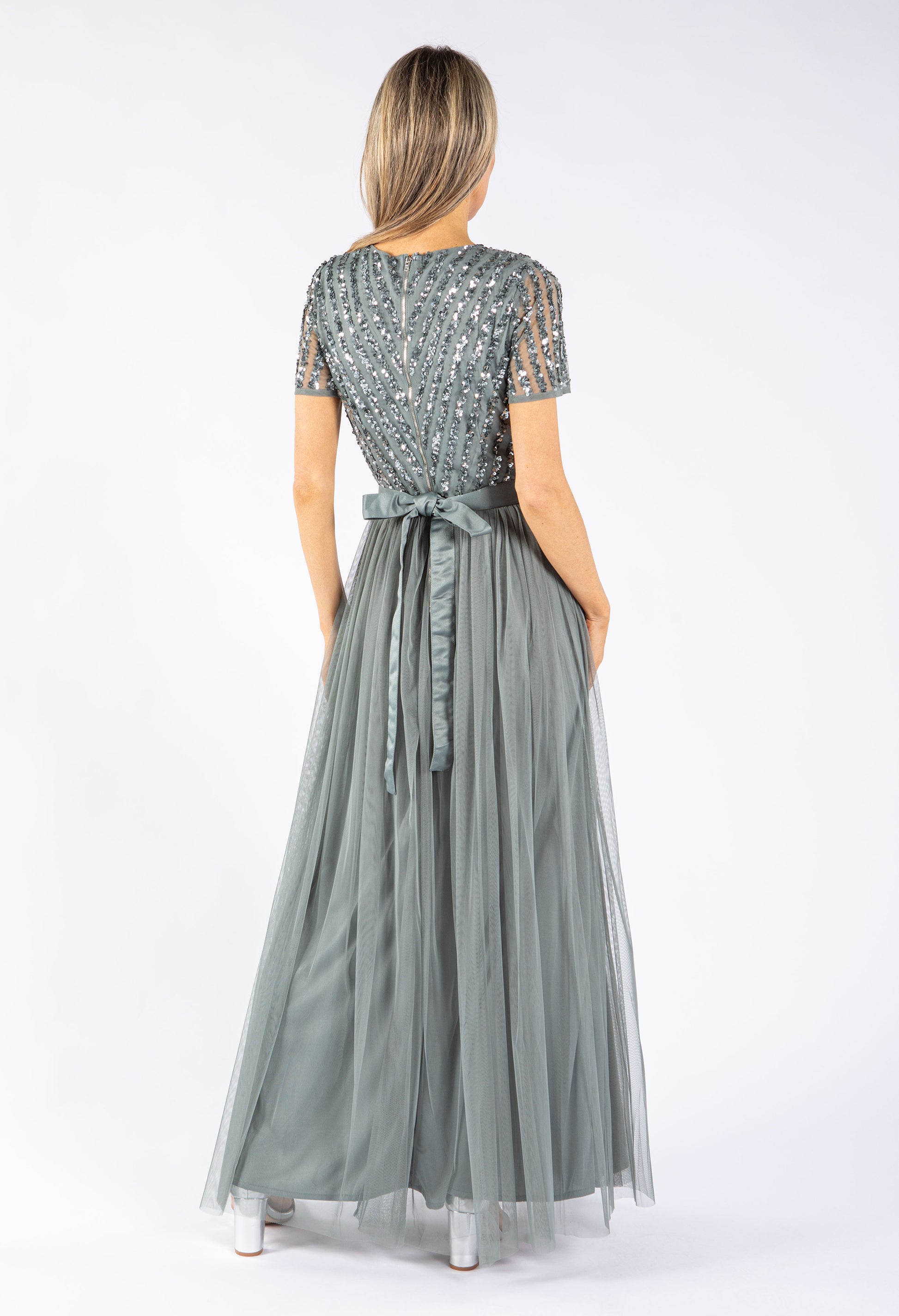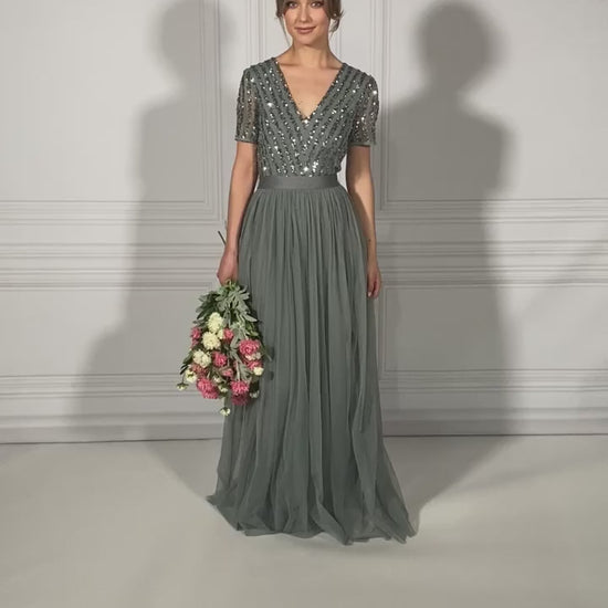 Maya MISTY GREEN v-neck full length tulle skirt dress with delicate sequins top and satin belt.
