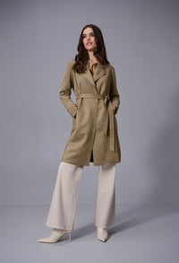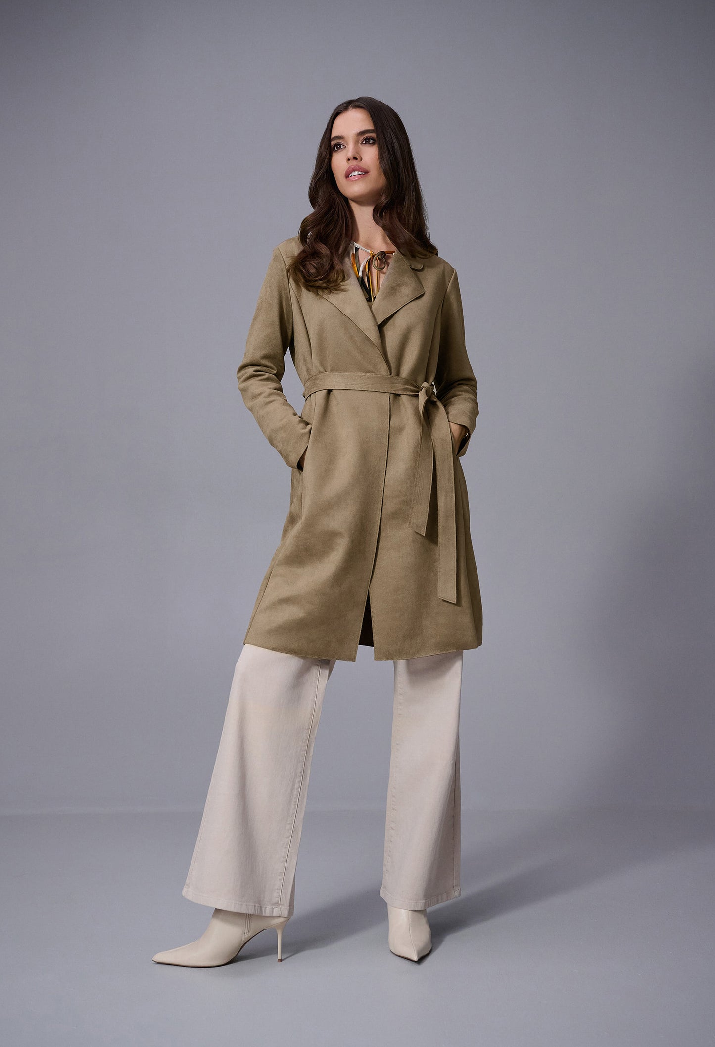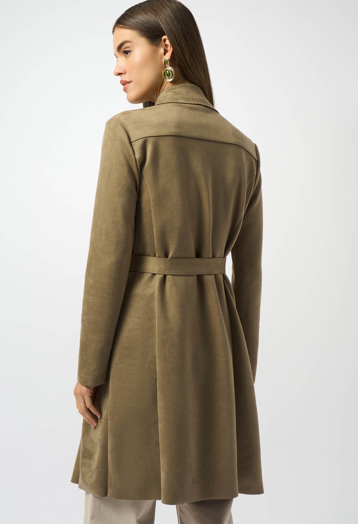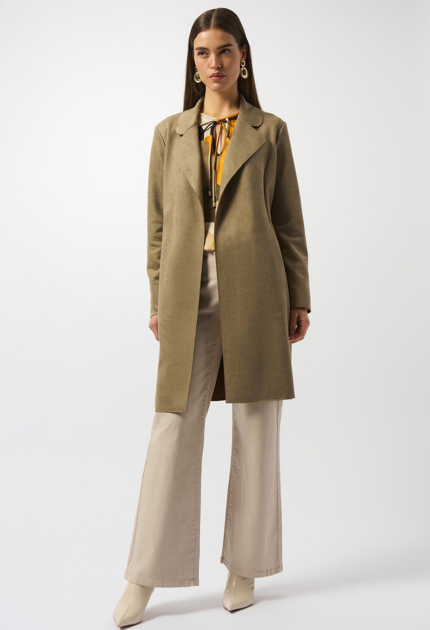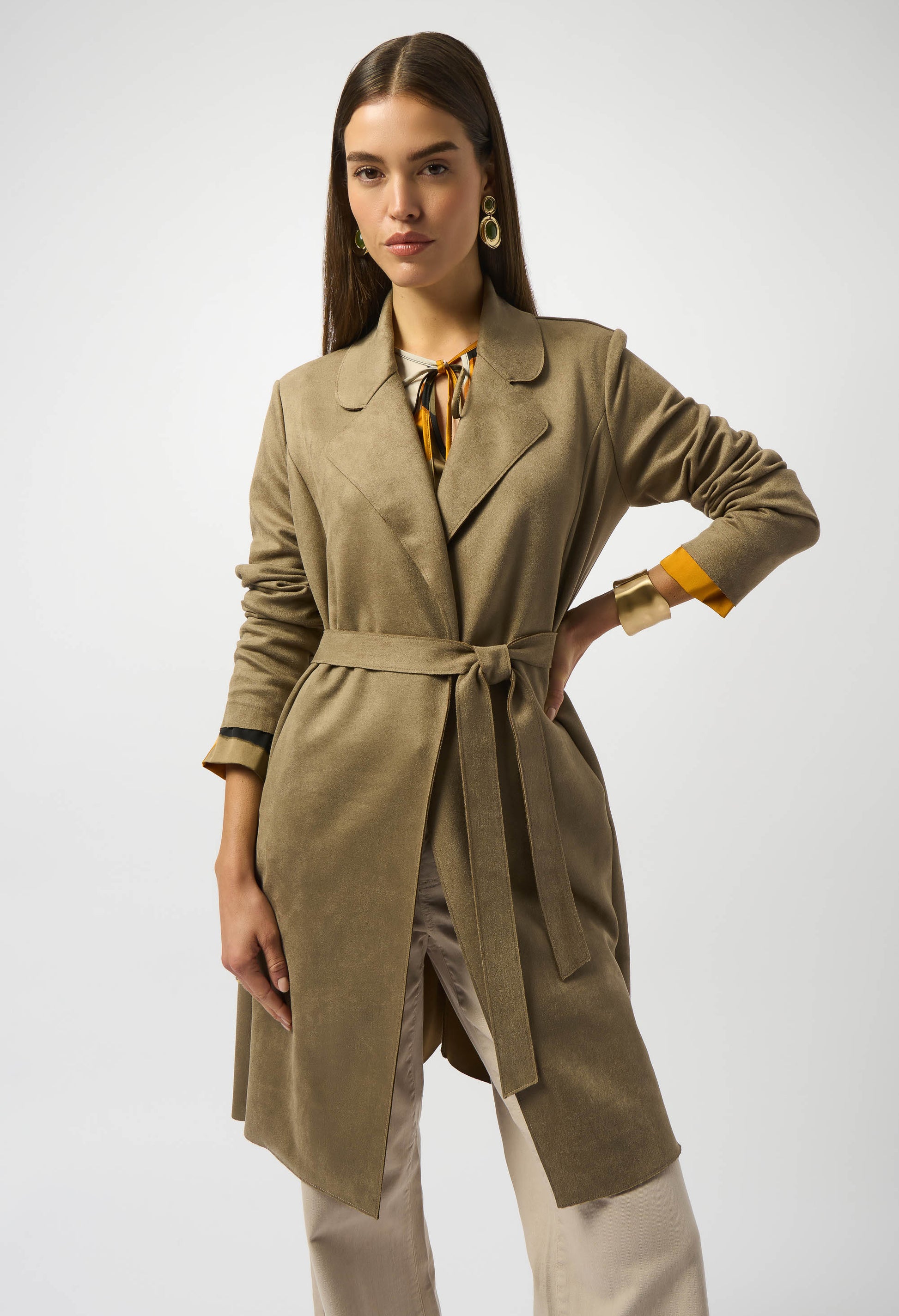 Step out in style with the Joseph Ribkoff trench coat, a perfect blend of sophistication and versatility. Featuring an open front with a belt closure, this knee-length coat offers a regular fit and a notched lapel. Ideal for casual, semi-formal, and office settings, its plain pattern and long straight sleeves make it a timeless piece. Enjoy added functionality with belted pockets, making it a practical yet chic addition to your wardrobe.