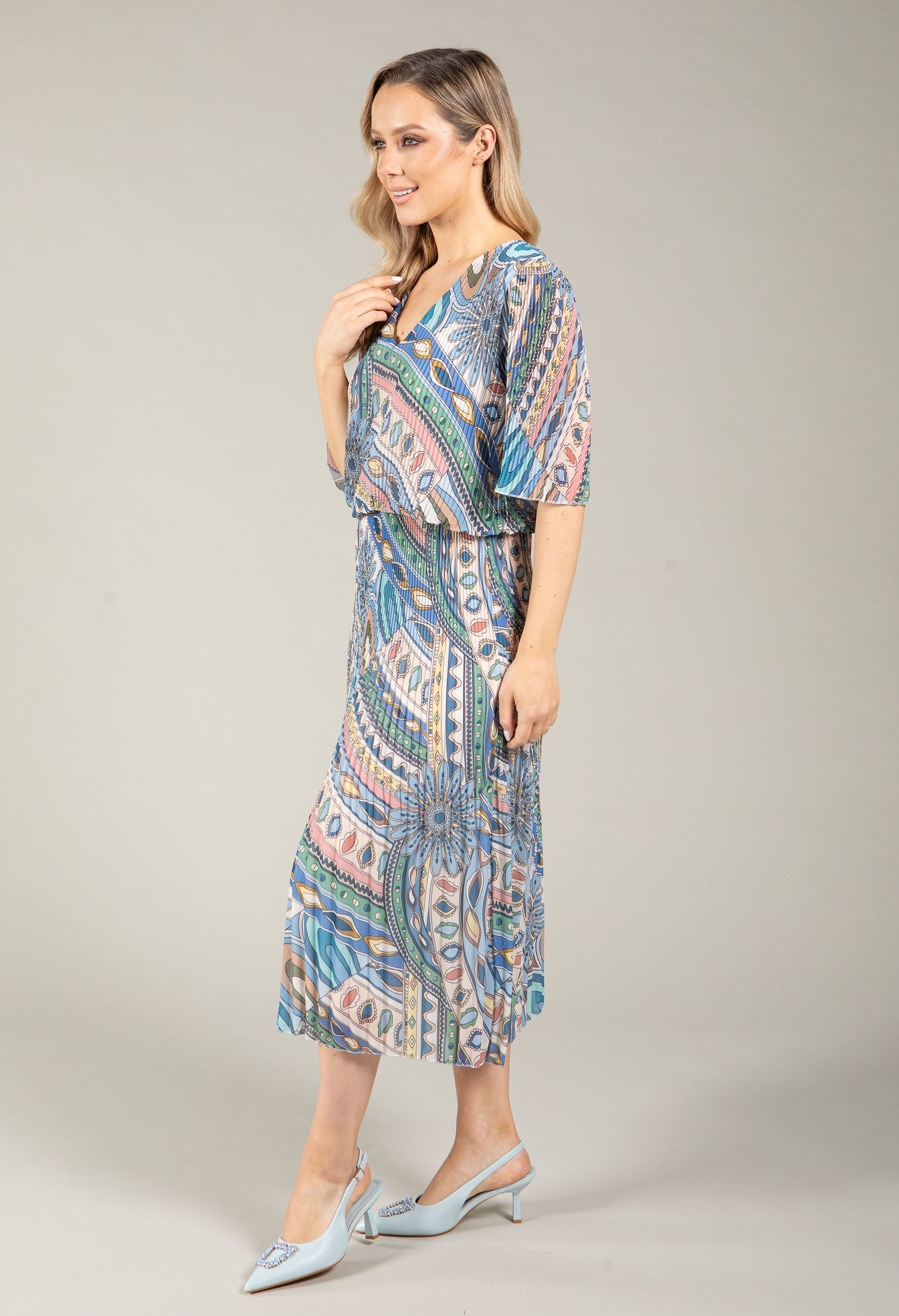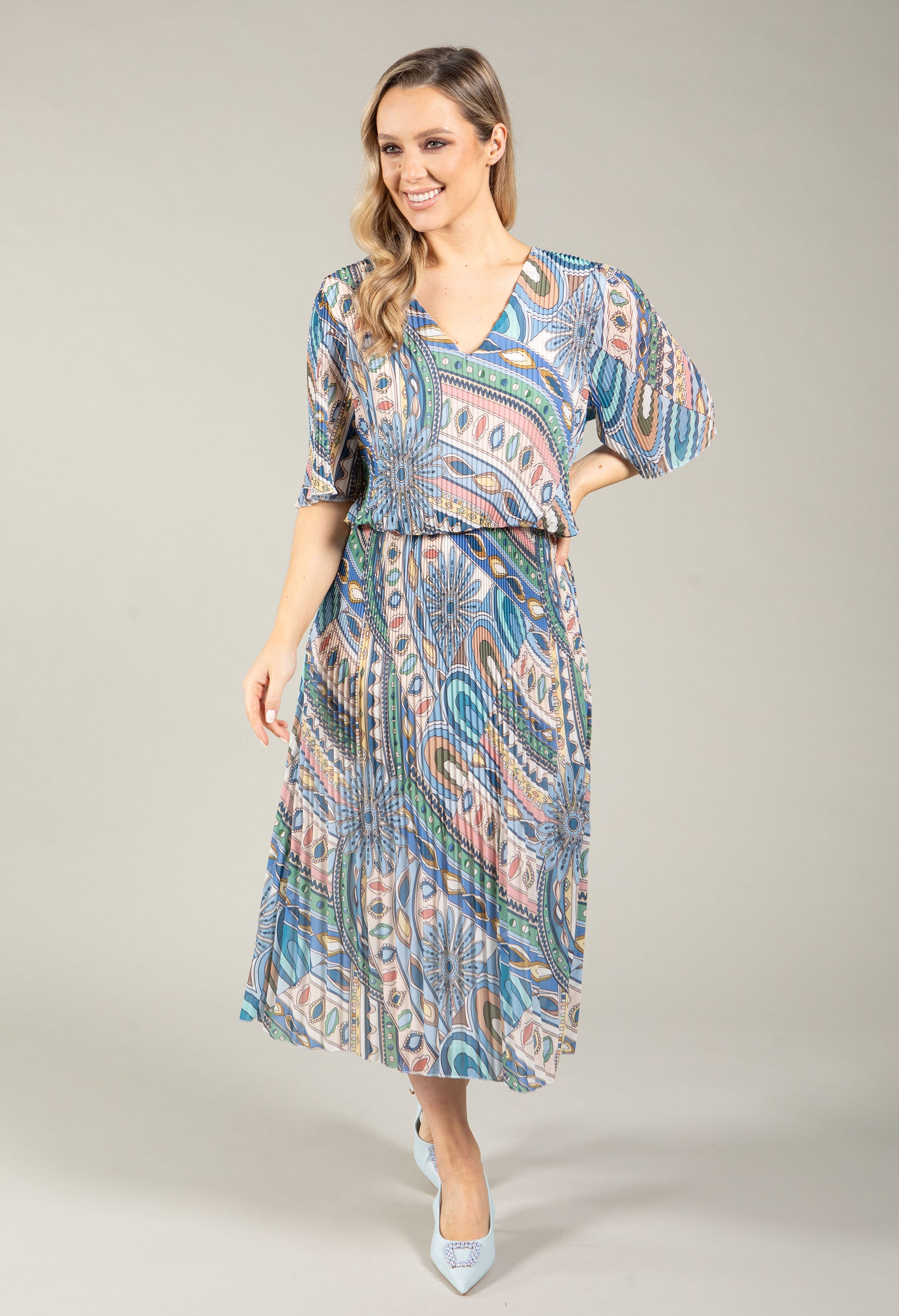 This charming midi dress combines timeless paisley print with contemporary plisse pleating for an effortlessly chic look. The V-neckline and half sleeves flatter every frame, while the elasticated waistband provides comfort and ease. Fully lined with a relaxed pop-over cut, it's your go-to piece for versatile, everyday style.
