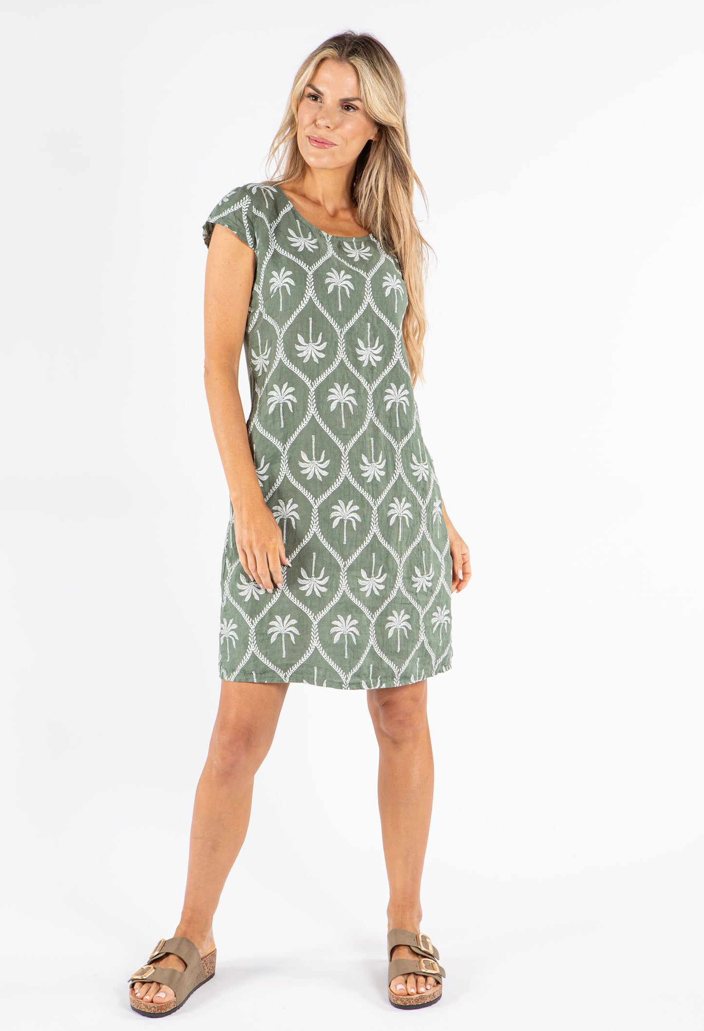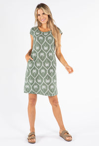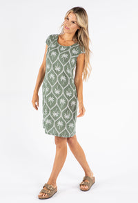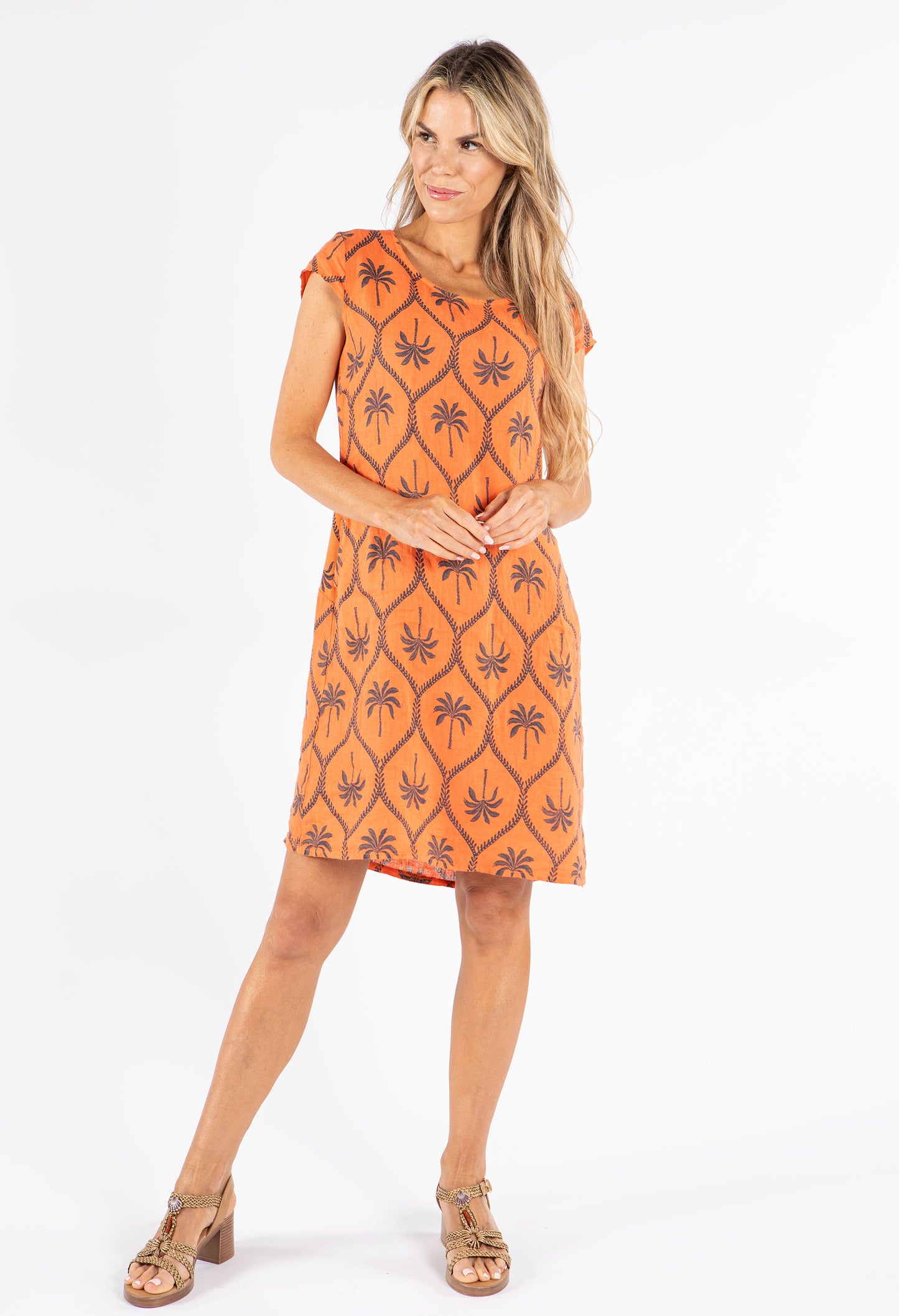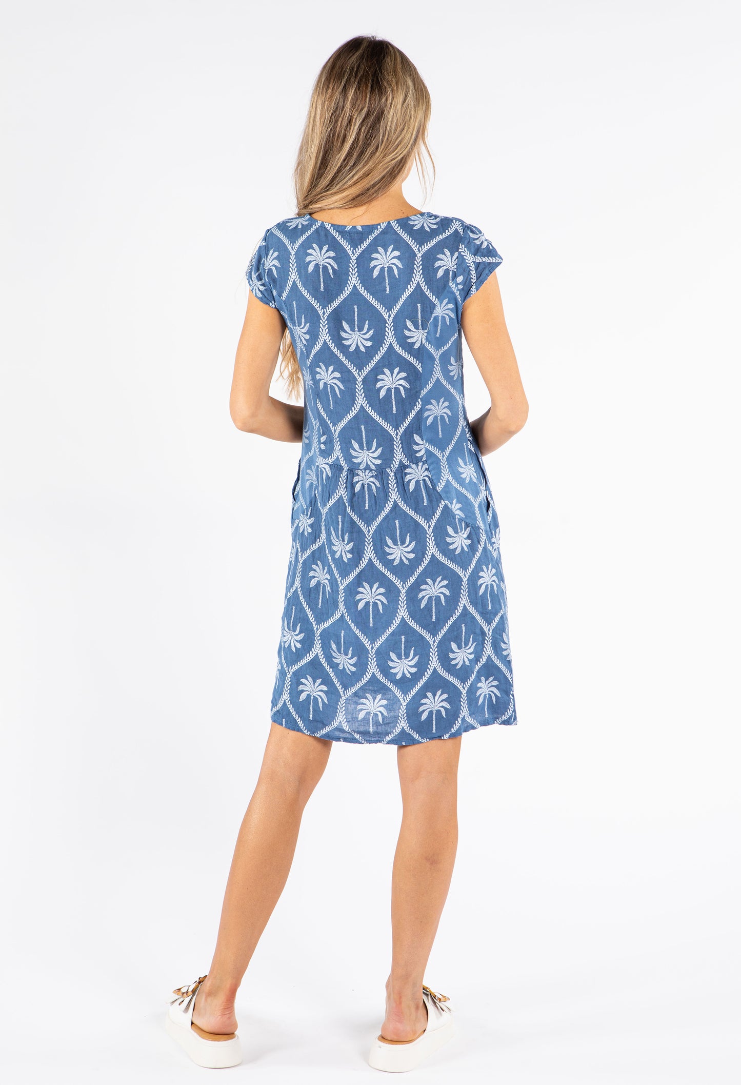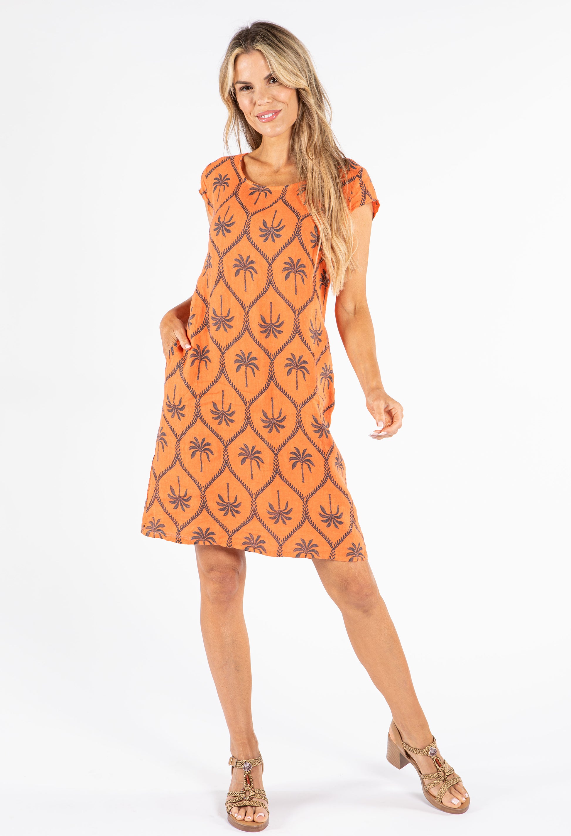 Complete your look with this Palm Print Linen Dress featuring a round neckline, short sleeves, ribbed panelling, and side pockets. Made from 100% linen, this dress is a customer favourite for its comfortable fit and stylish design.