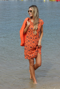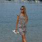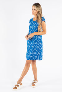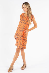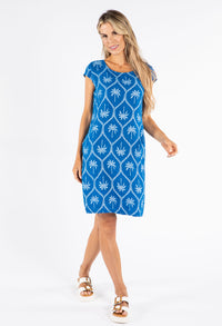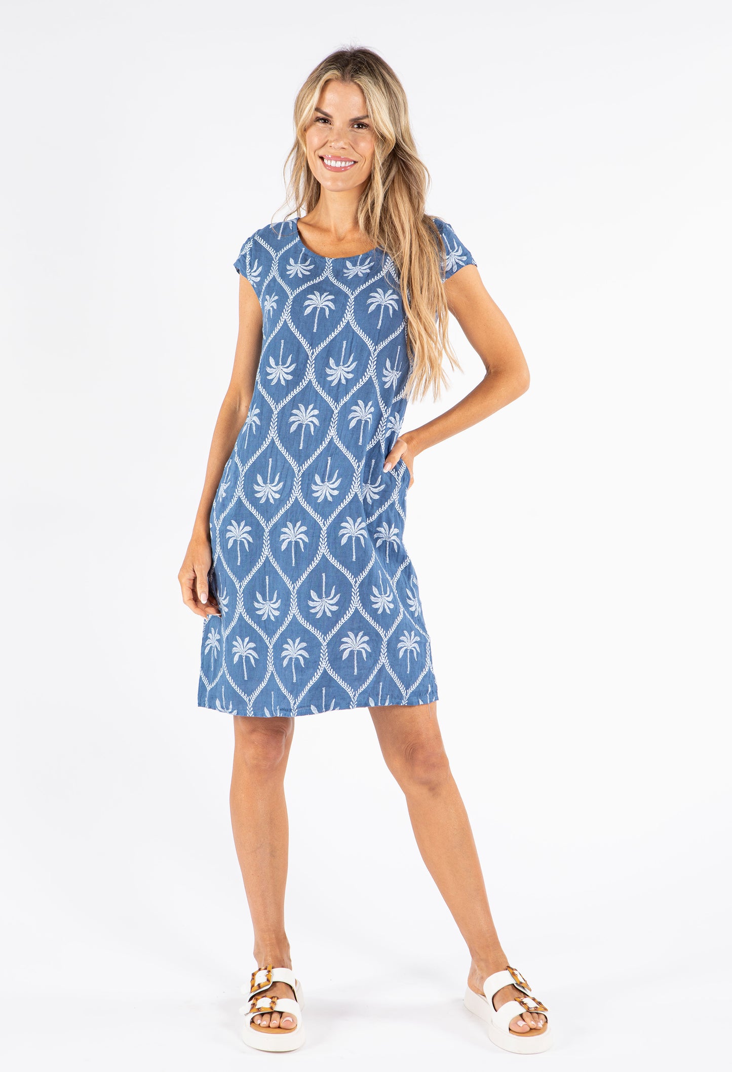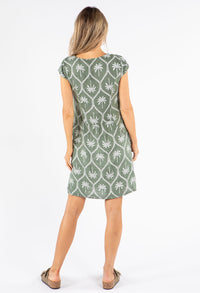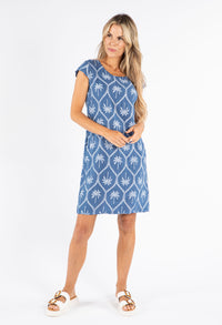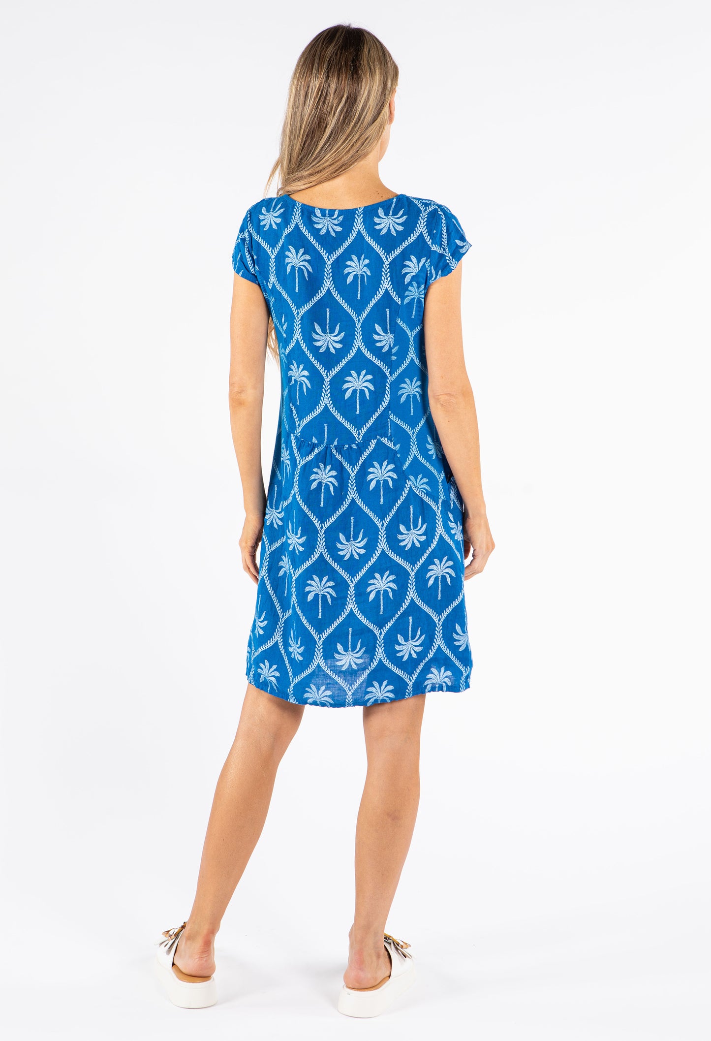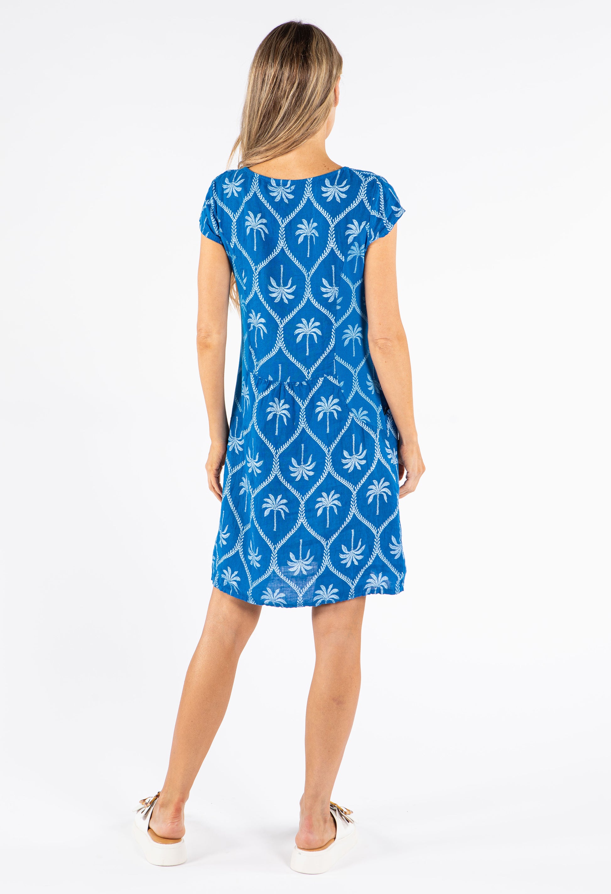Complete your look with this Palm Print Linen Dress featuring a round neckline, short sleeves, ribbed panelling, and side pockets. Made from 100% linen, this dress is a customer favourite for its comfortable fit and stylish design.