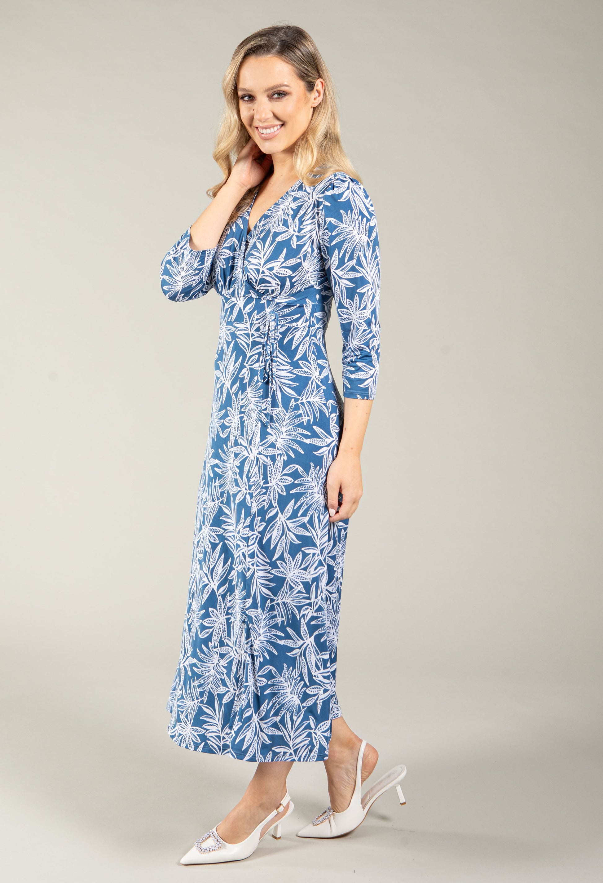 A sophisticated midi dress featuring a V-neckline and three-quarter sleeves with a faux wrap bodice. The textured stretch fabric offers comfort and movement, while full lining ensures coverage. The tropical palm print adds contemporary appeal to this versatile wardrobe essential.