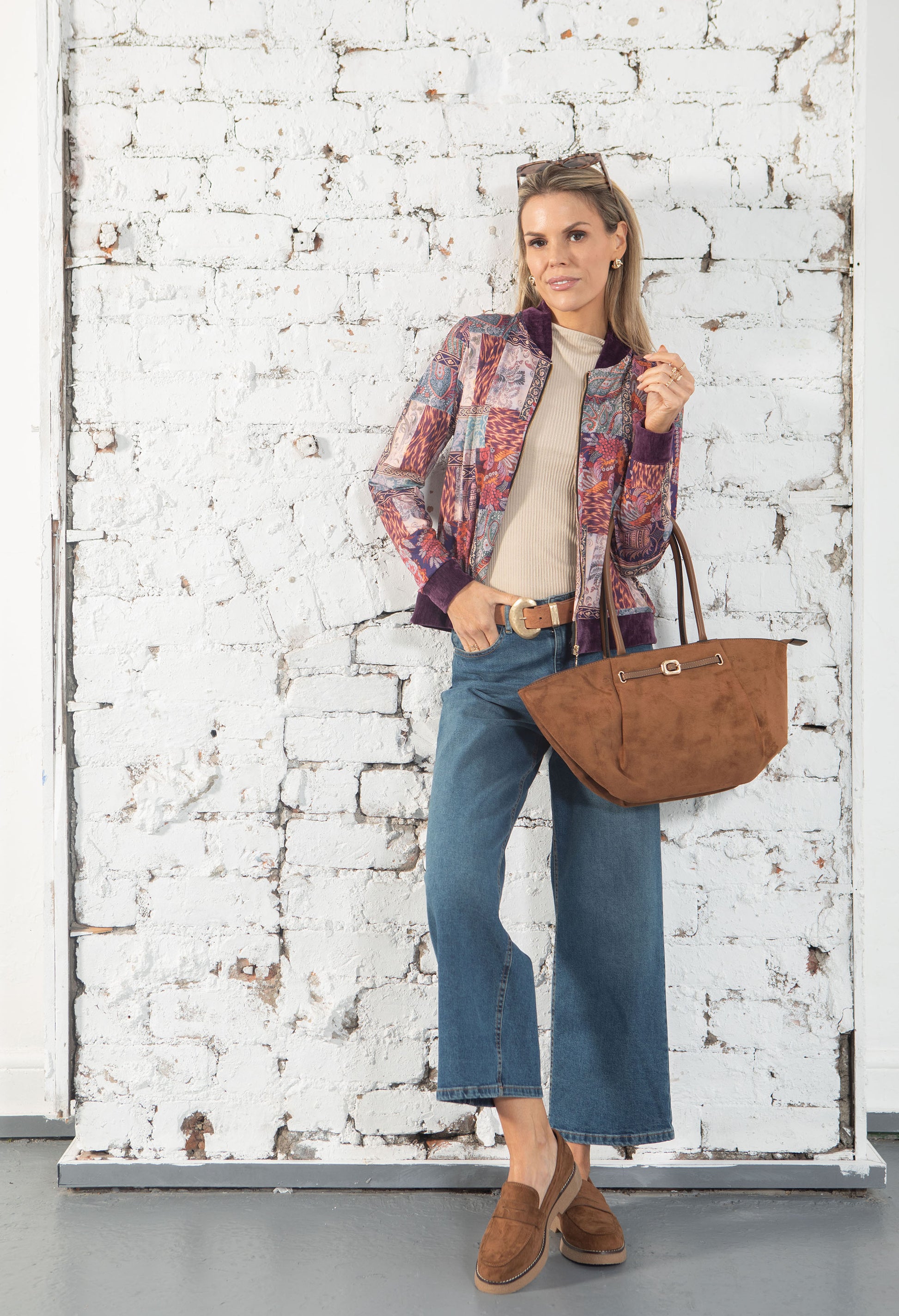This bomber jacket showcases a zip-up closure and long sleeves, accented with gold hardware and velvet collar and cuffs. Made from stretch material, it features a bold patchwork design print for a fashionable edge.