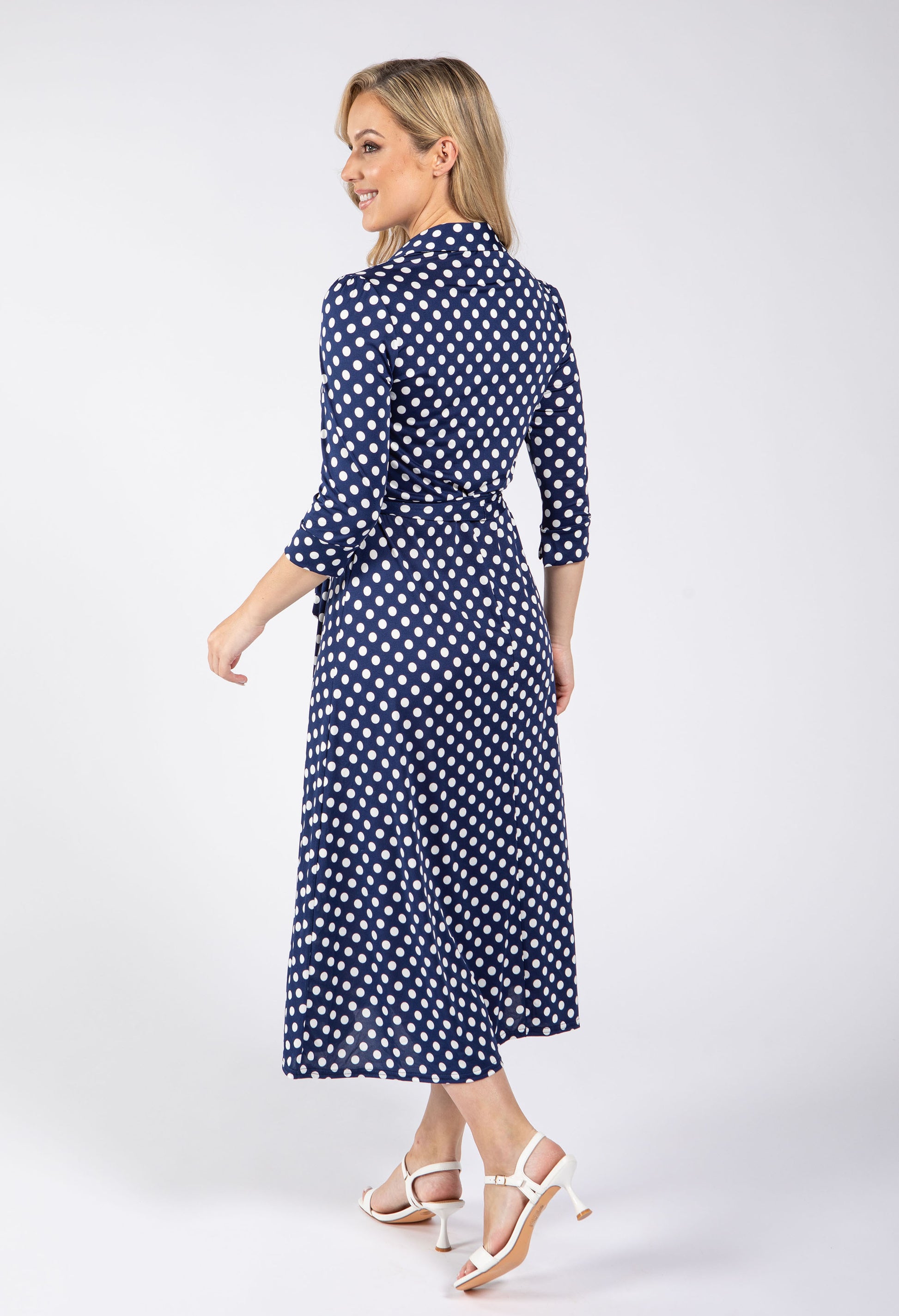 The Paulette Polka Dot Dress combines timeless elegance with everyday versatility. This midi-length dress features a classic collar and button-through front for effortless styling, while the 3/4 length sleeves offer refined coverage. Crafted from silky-feeling material that drapes beautifully, it's finished with a flattering belt to define your silhouette.