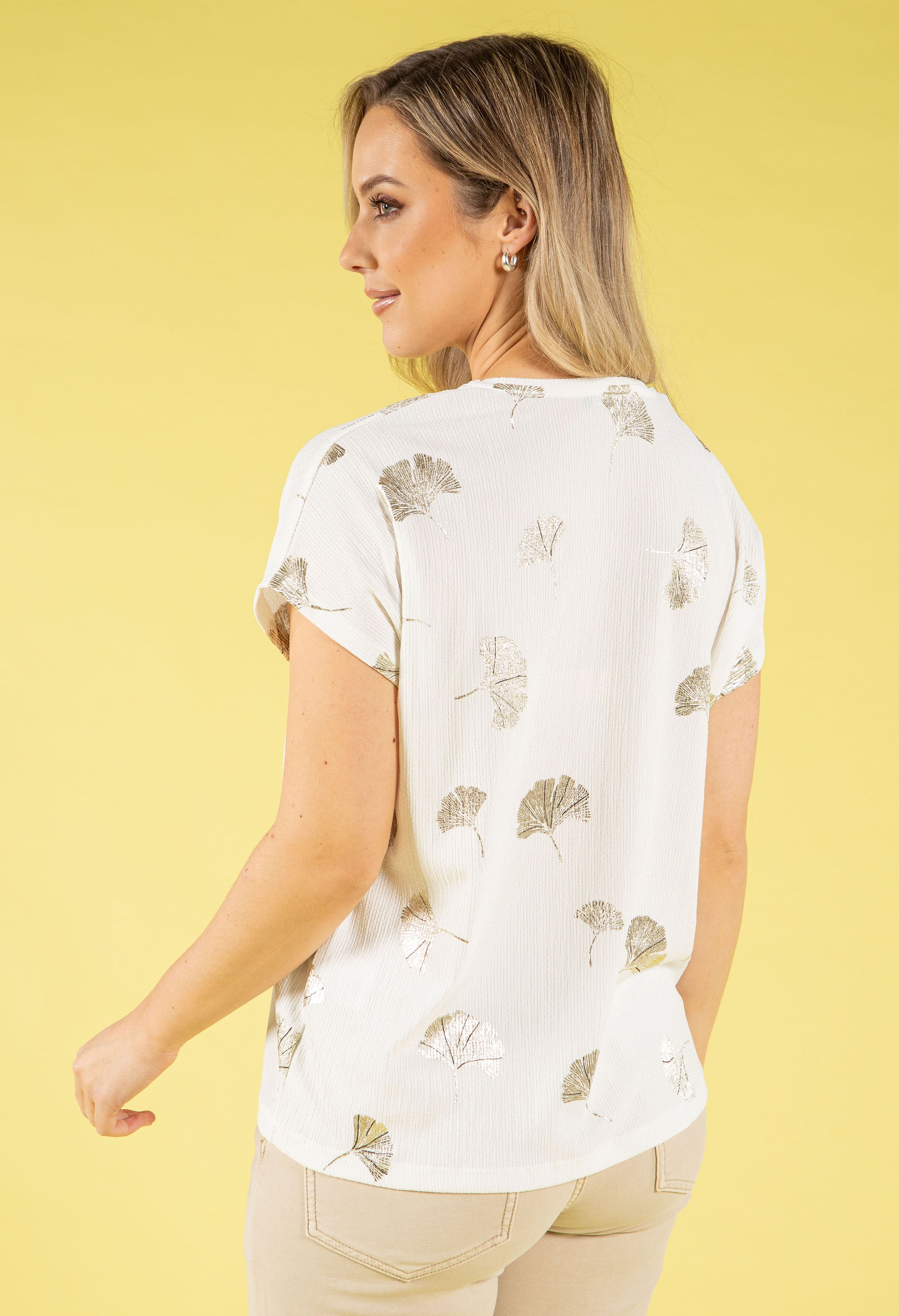 Elevate your everyday style with this charming Pearl Fan Print Top. Featuring a classic round neckline and comfortable short sleeves, this piece showcases an eye-catching fan print enhanced with shimmering gold foil and sparkling rhinestone accents. The relaxed fit ensures all-day comfort while the luxe detailing adds a touch of sophistication to casual outfits.