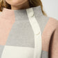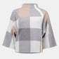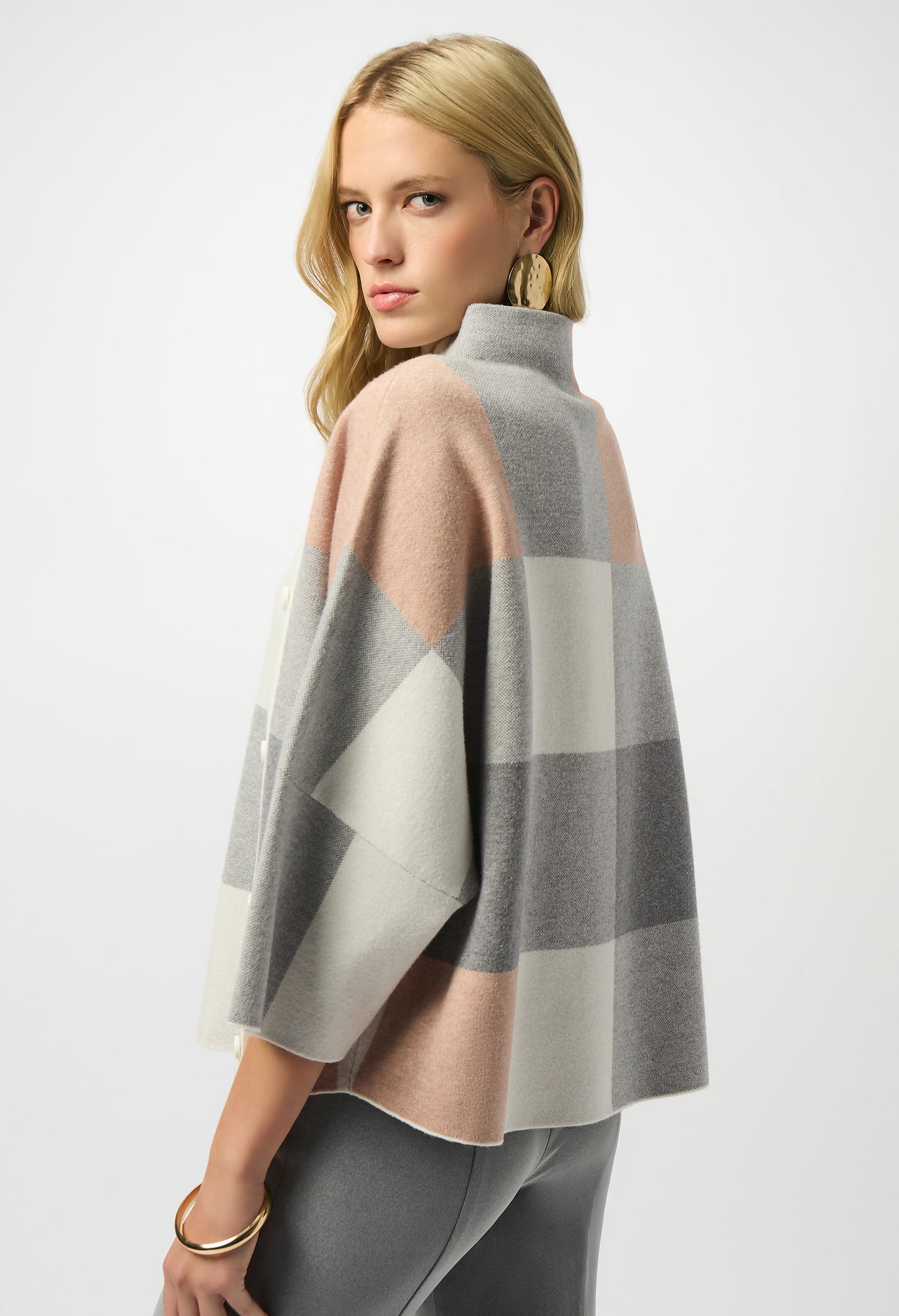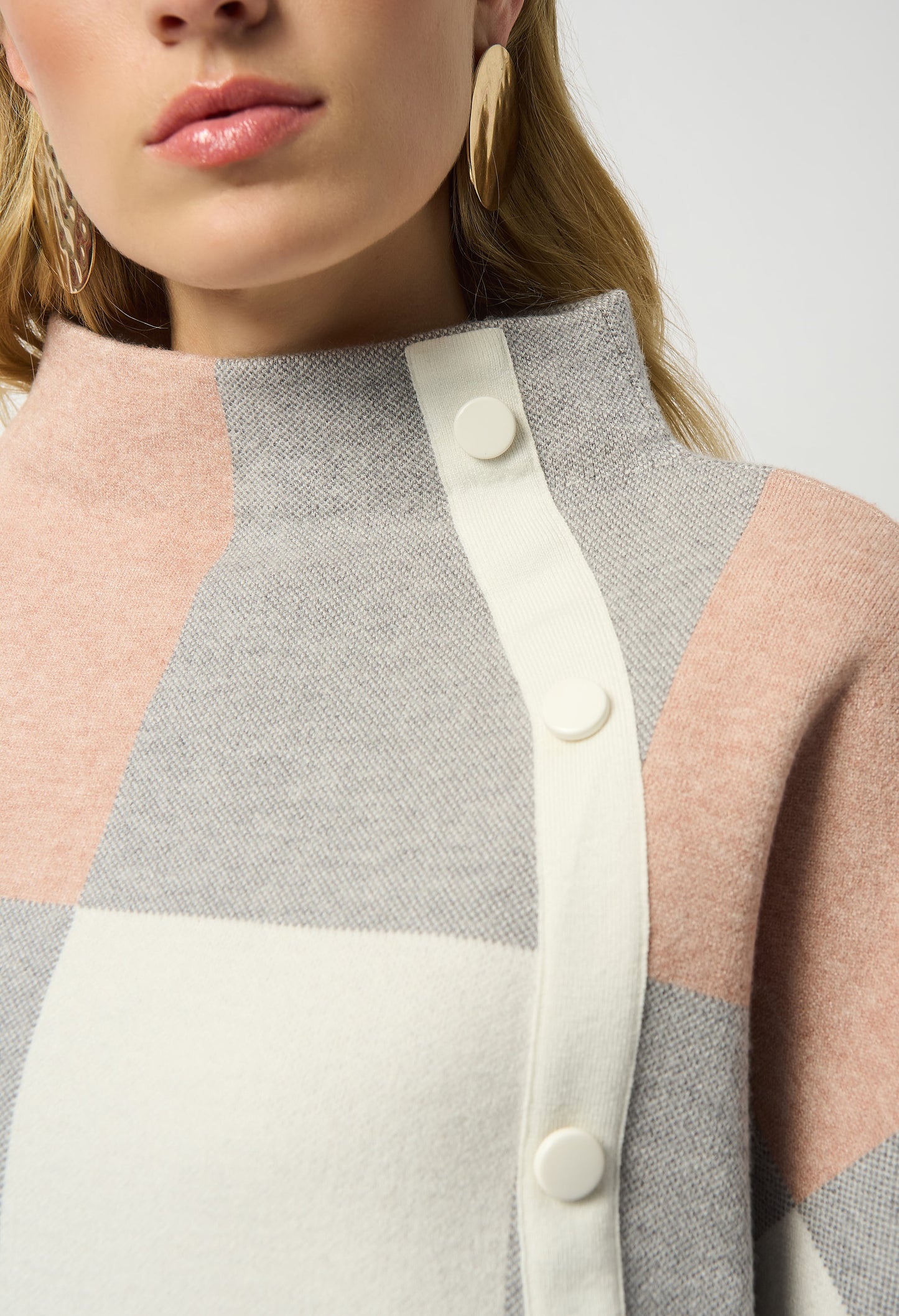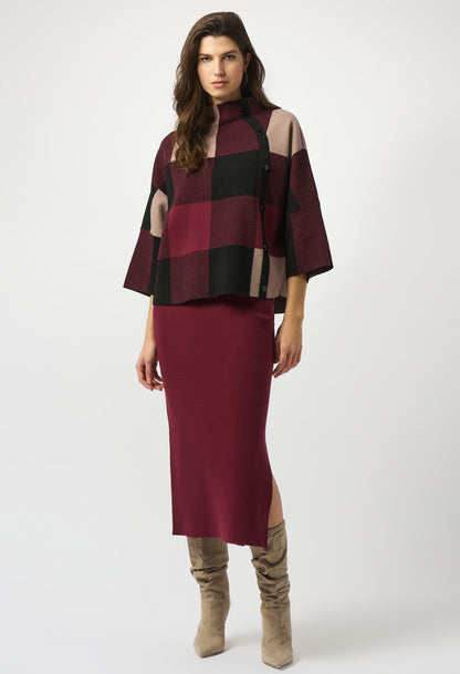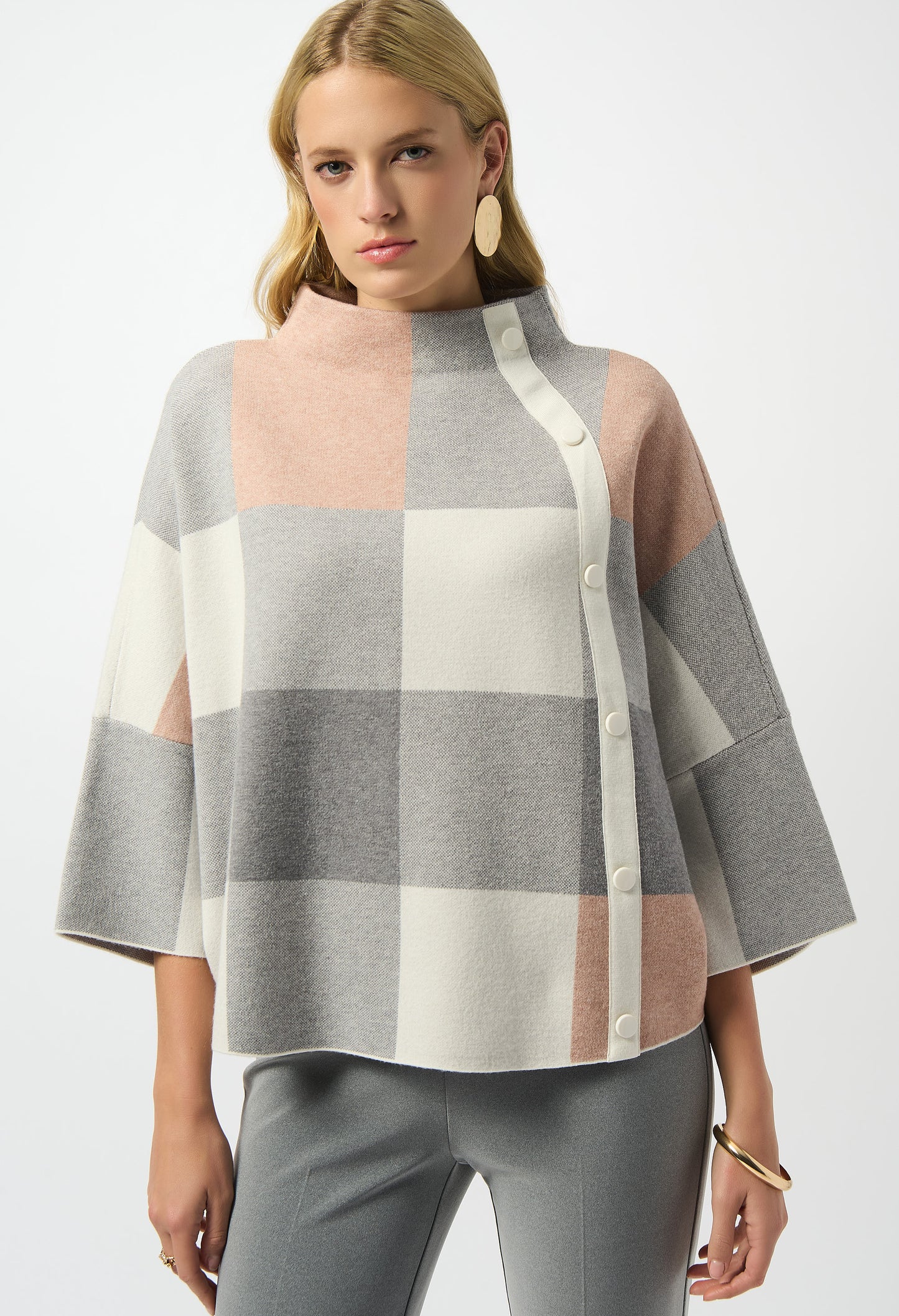 We all need a little plaid in our wardrobe. This cozy jacquard sweater knit top features a striking three-tone plaid pattern that's just as extraordinary as its design. A loose-fitting funnel neck adorned with decorative buttons on the side, along with three-quarter bell sleeves and a roomy fit give this piece an endlessly attractive appeal.