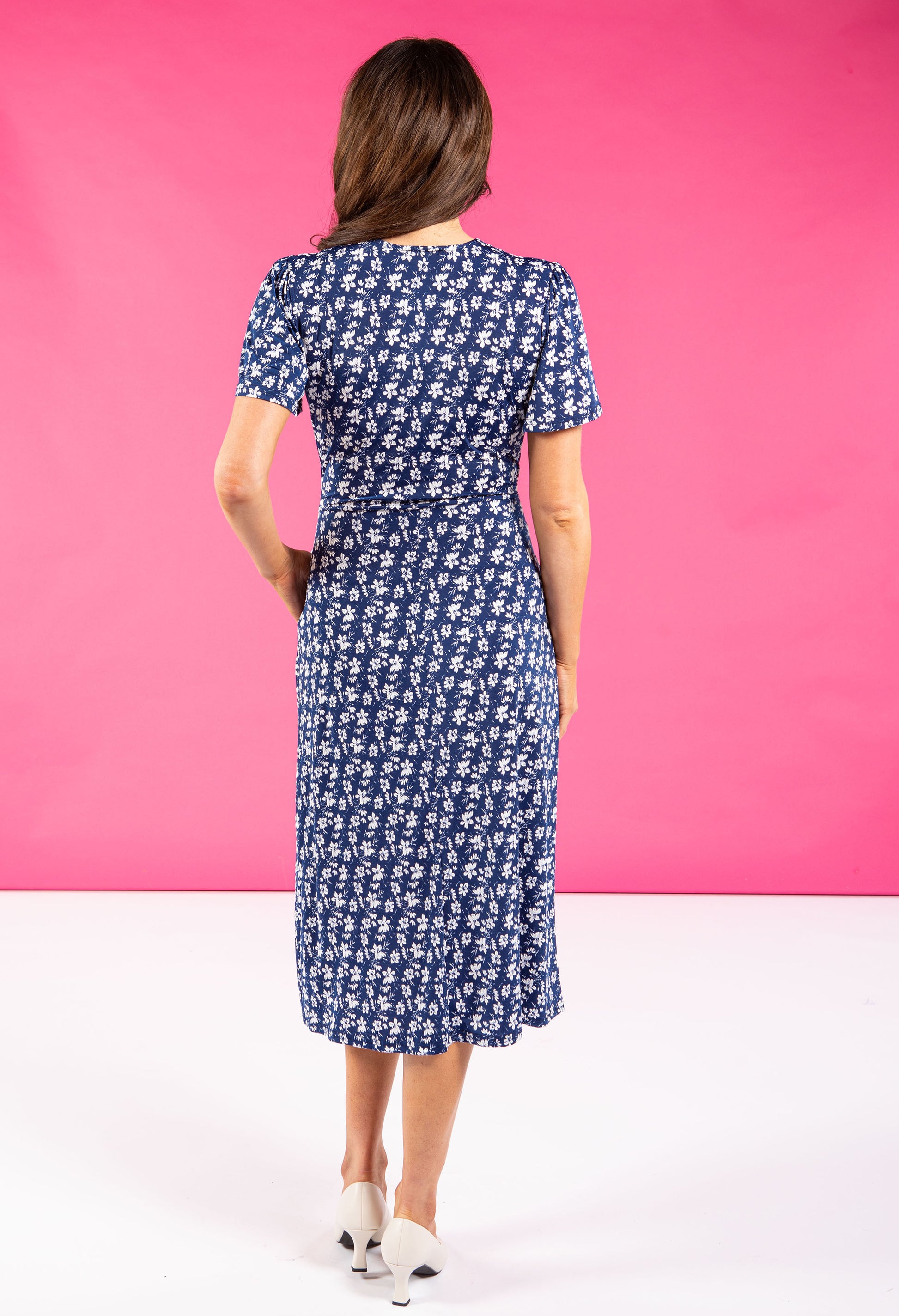 Effortlessly elegant, this midi dress features a flattering V-neckline and faux wrap bodice that creates a refined silhouette. Short angel sleeves add a touch of femininity, while the tie waist belt lets you define your shape. Practical side pockets keep essentials close, and the stretch fabric moves with you throughout the day. Finished with a vibrant floral print and subtle texture.