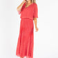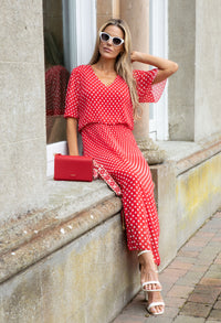 This dress features a V-neckline, plisse pleats, and a maxi length for a flattering silhouette. The short, drop shoulder sleeves and fully lined design add comfort and coverage, while the playful polka dot print adds a touch of charm. Available in a free size for a perfect fit.