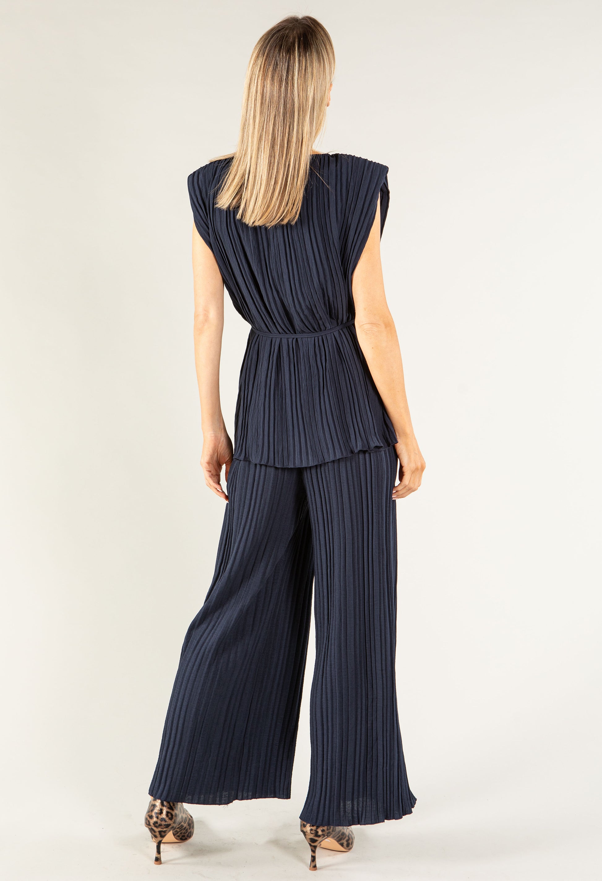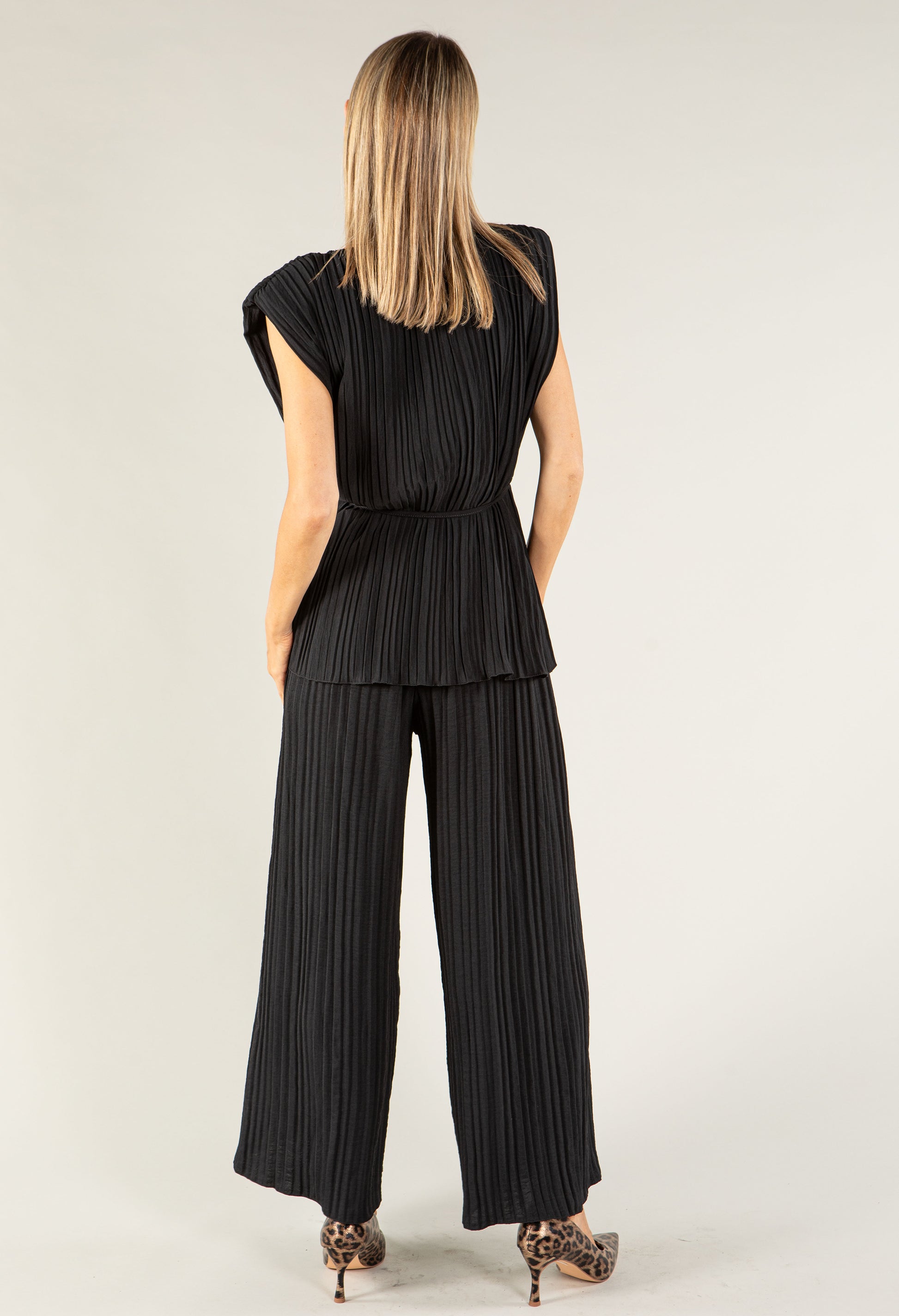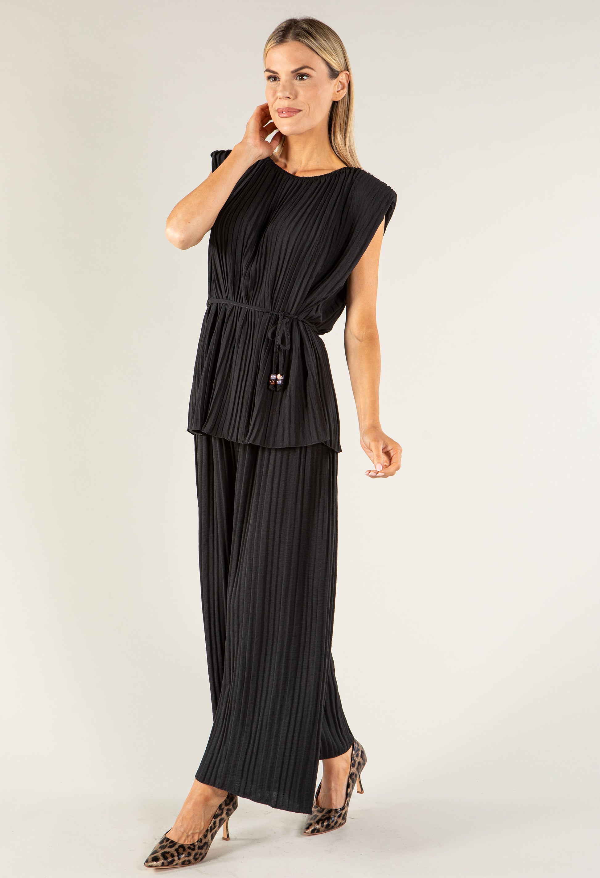 Discover effortless elegance with this Plisse Pleated Co-Ord set. The sleeveless blouse features structured shoulder pads, a flattering round neckline, and a stylish belt to define your waist. Paired with high-waisted trousers boasting an elasticated waistband and wide legs, this ensemble offers both comfort and a chic, modern silhouette.