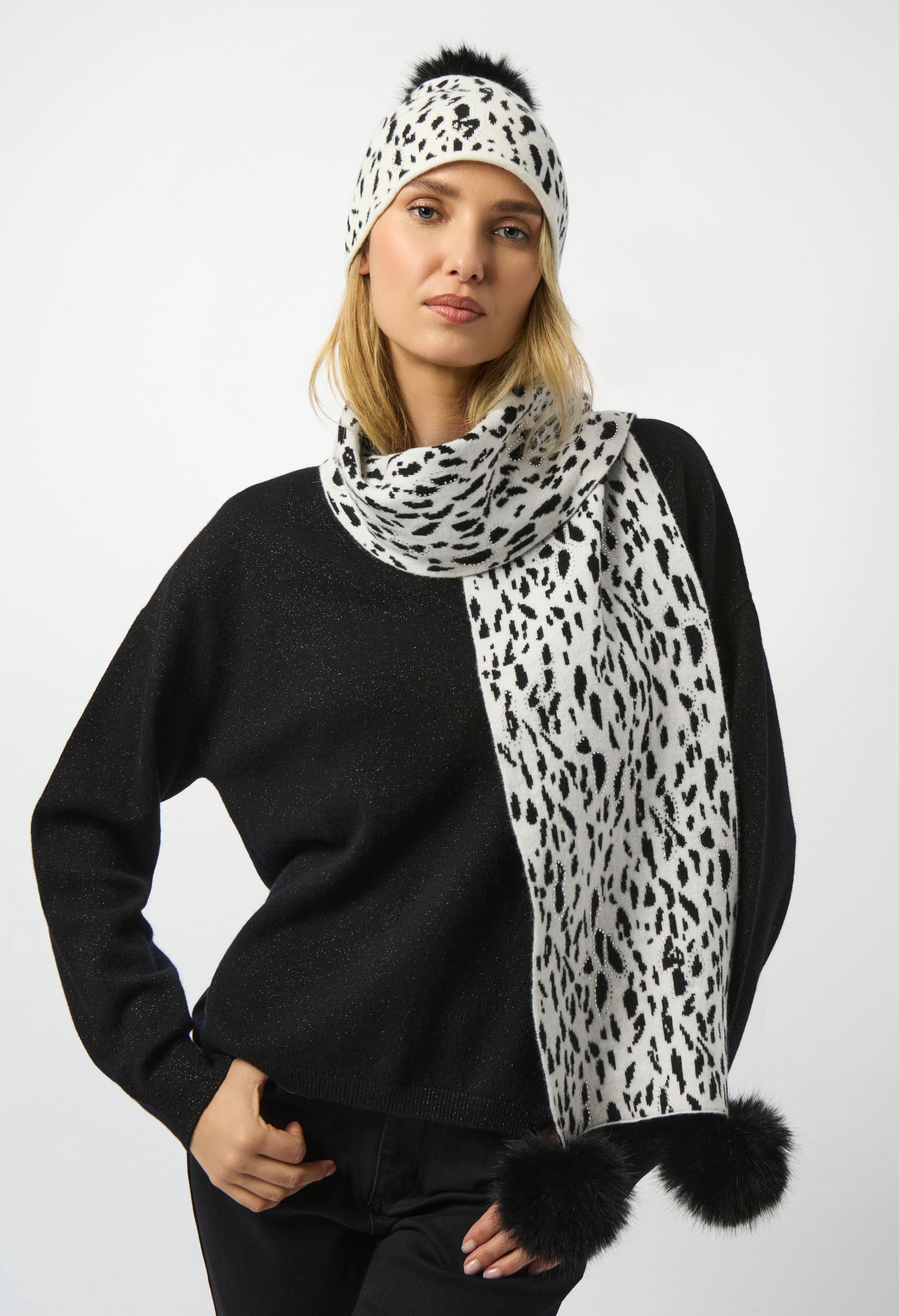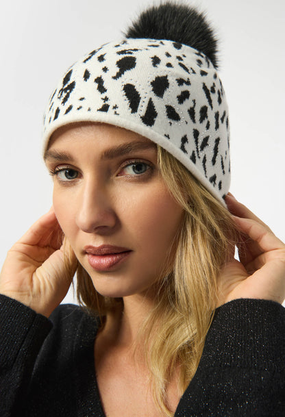 Step out in style with this Joseph Ribkoff hat that features intricate pom-pom and jewel embellishments, adding a touch of sophistication to your wardrobe. The bold animal-print pattern makes a striking statement, ensuring you stand out from the crowd. Ideal for various occasions, this unique design blends elegance with a trendy edge, making it a must-have addition to your collection.