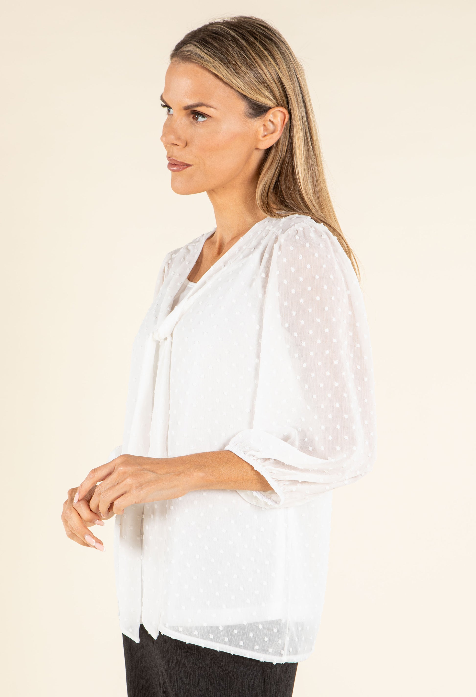 This elegant blouse showcases a V-neckline with a textured feel, 3/4 length sleeves featuring elasticated cuffs, and a front tie pussy bow, along with an extra cami.