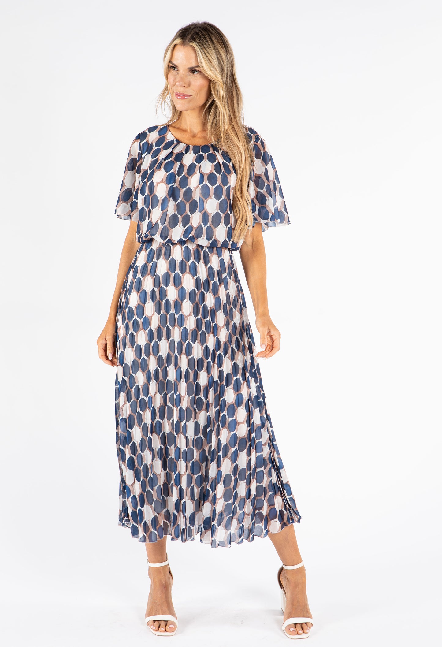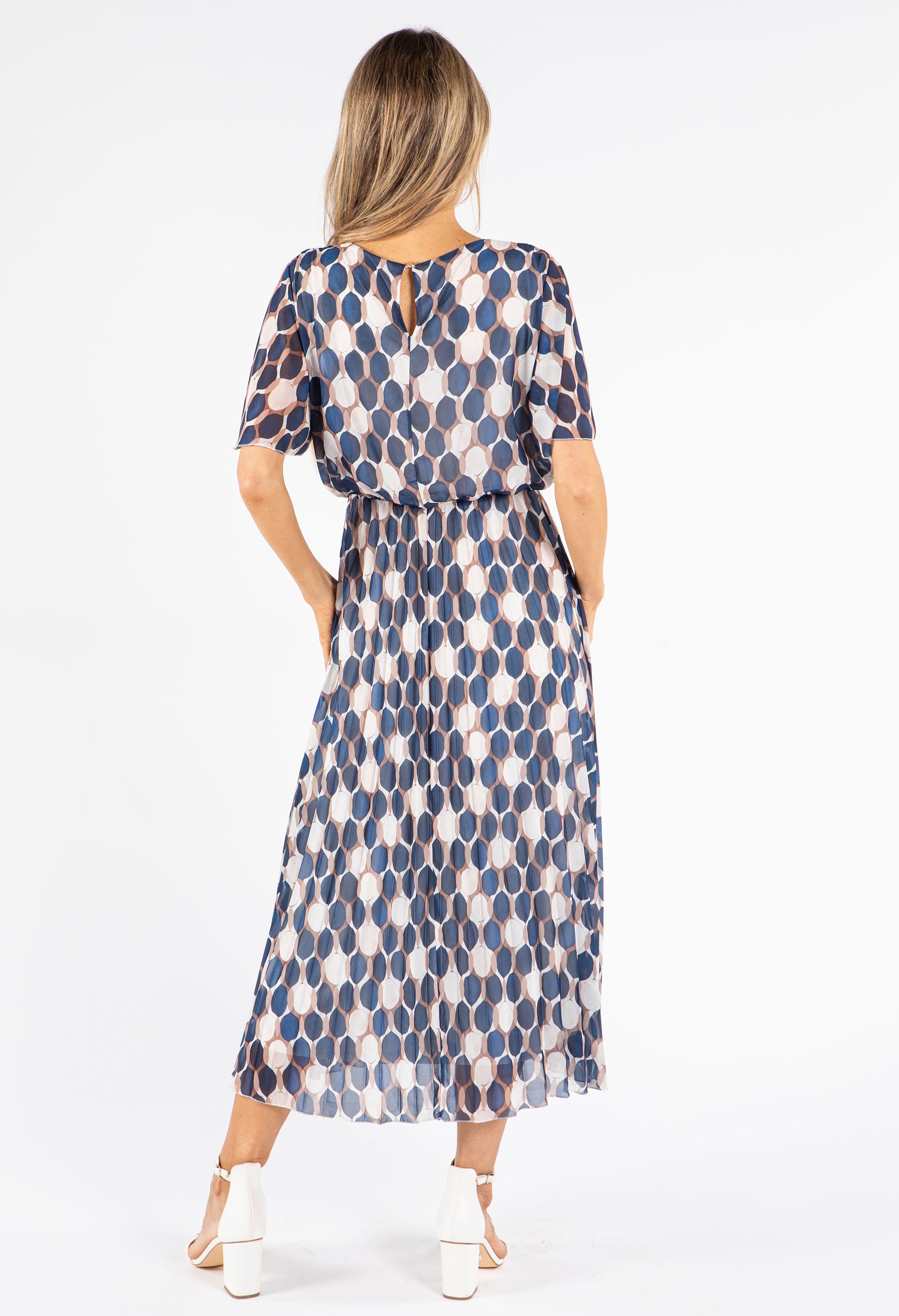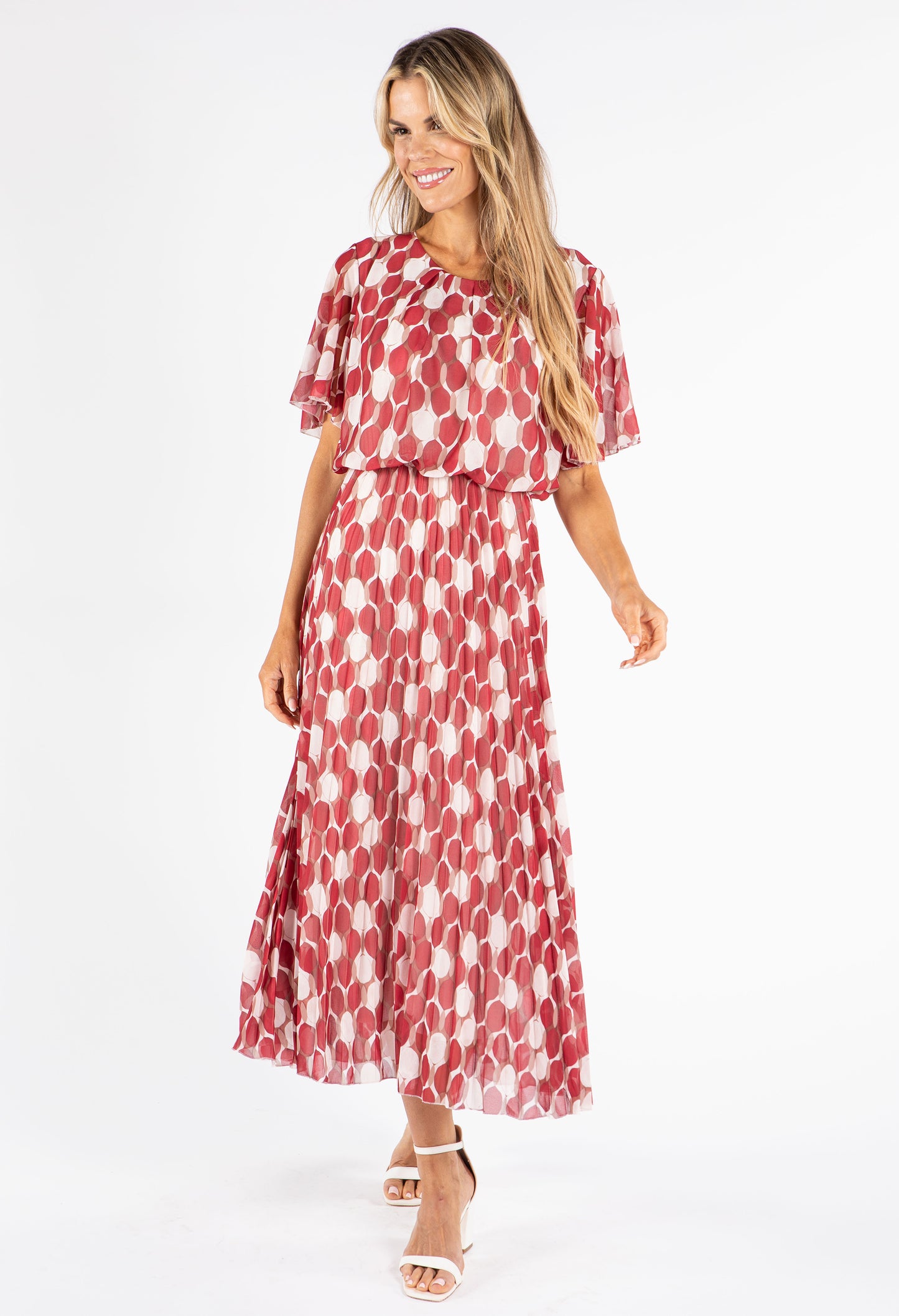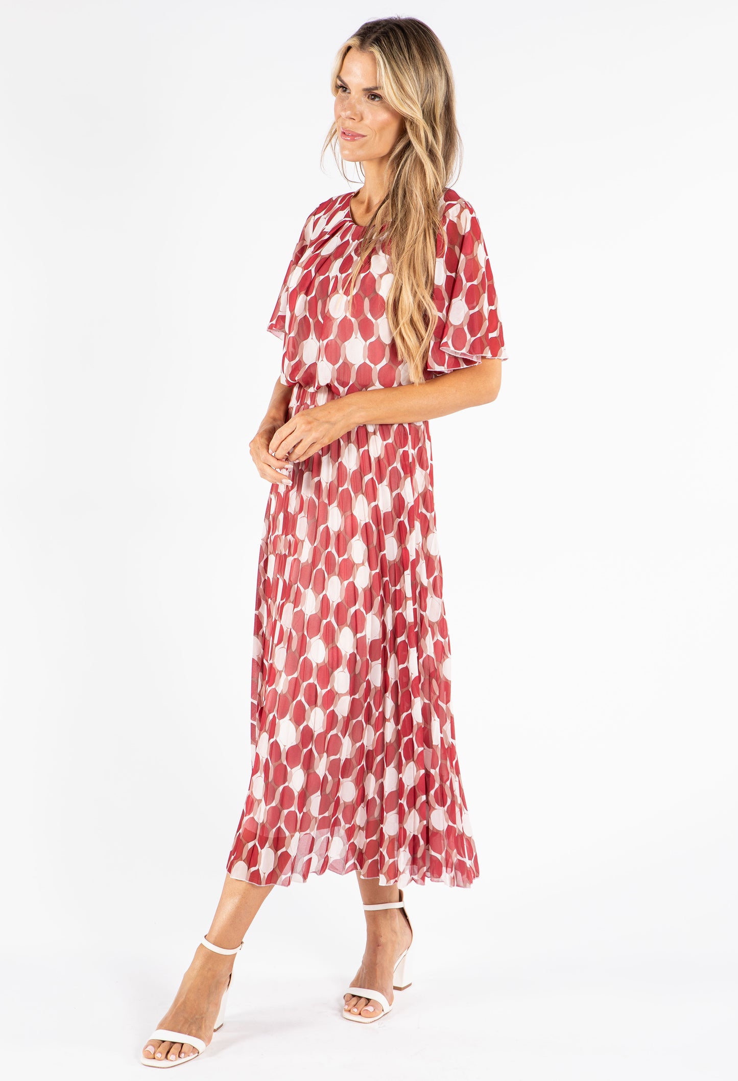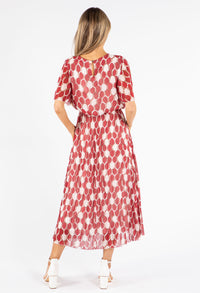 This retro-inspired dress features plisse pleats and a round neckline, complemented by elegant angel sleeves. Designed in a pop-over style with an elasticated waistband for a flattering fit, it is fully lined and fastens at the back with a button closure. The retro print and free size make it a timeless and versatile addition to your wardrobe.