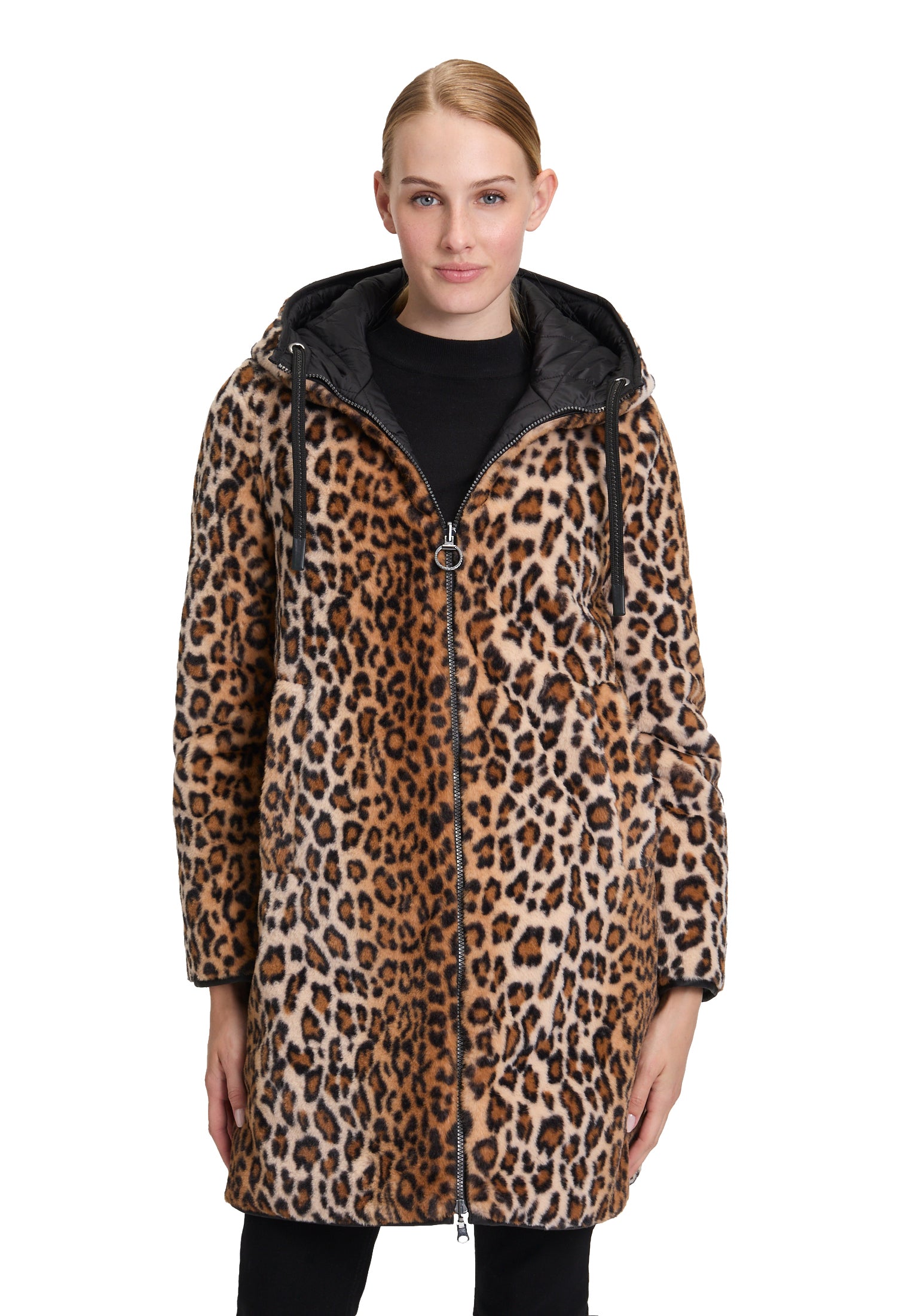 This reversible quilted coat features an A-line silhouette with a total length of 92 cm and long sleeves for optimal coverage. It includes an attached hood with adjustable width, zippered and piped pockets for secure storage, and a two-way zip fastening for versatile wear and comfort.
