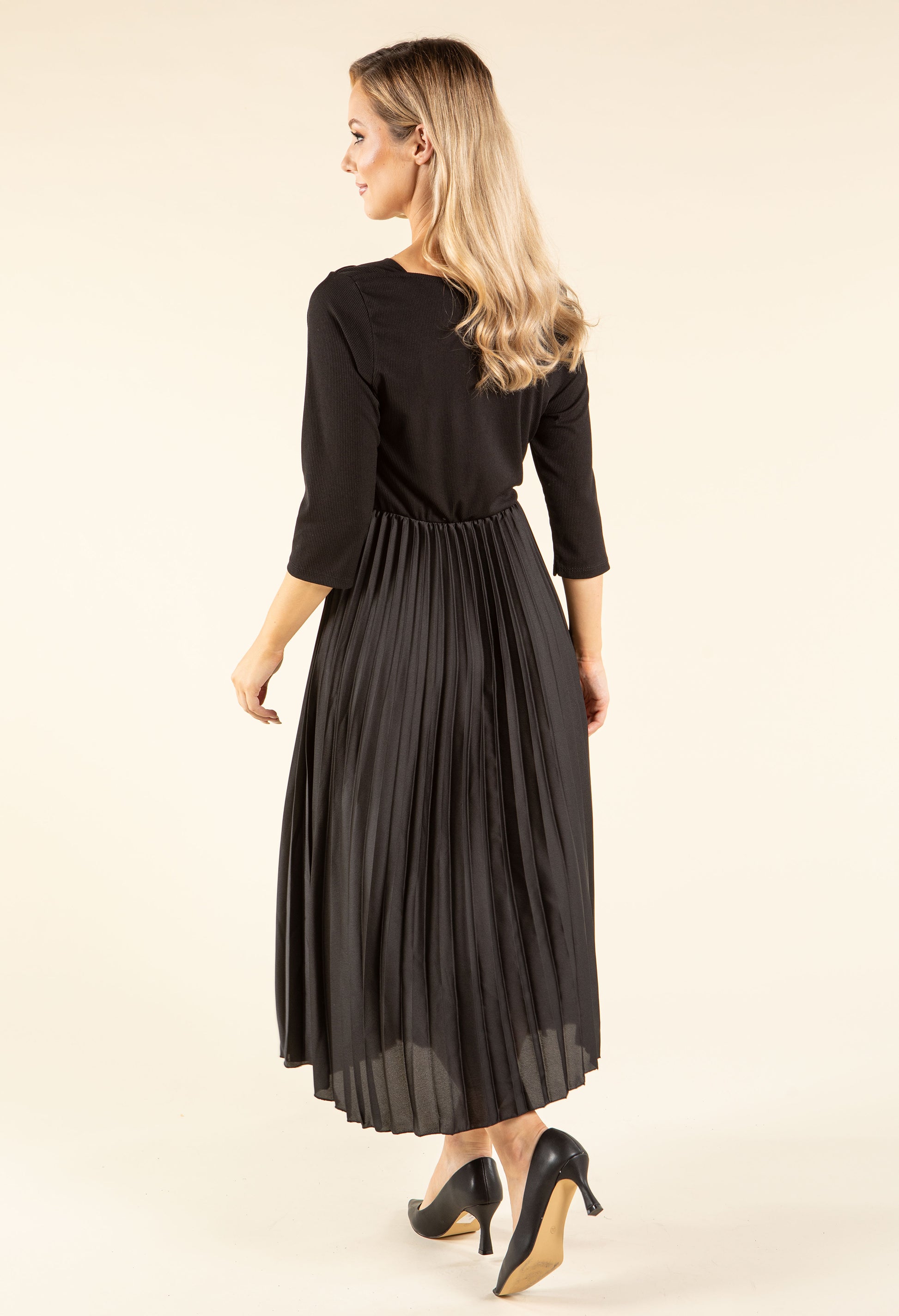 This elegant midi dress boasts 3/4 length sleeves, a boat neckline, and a ribbed bodice. It features an elasticated waistband for a flattering fit and a flowing pleated satin skirt for a graceful silhouette.