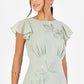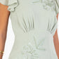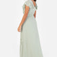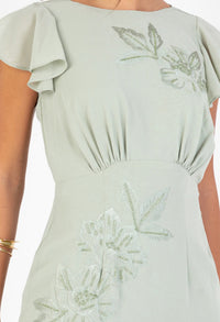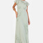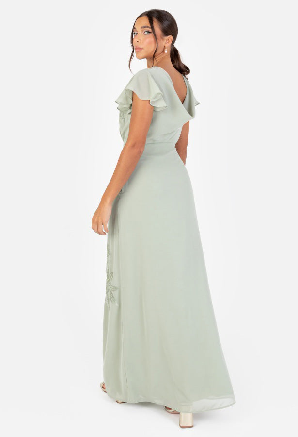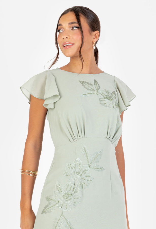 Elevate your bridal party ensemble with this enchanting bridesmaid dress. Fluttering short sleeves delicately frame the gathered bodice while a cinched waistline enhances the A-line silhouette. Most notably it features a dual neckline design: a classic round front that transitions into a gracefully draped cowl back for an alluring touch. Intricate floral embroidery adorns both the bodice and the flowing maxi skirt each detailed by hand sewn beads that add a subtle shimmer to every step. Style this Sage Green maxi with silver heels and dainty earrings for an effortlessly elegant look.