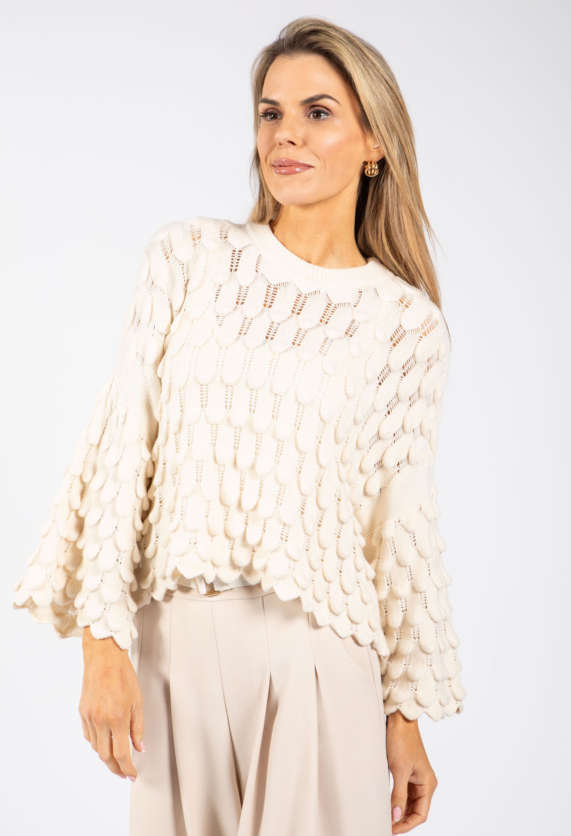 Embrace relaxed elegance with this charming pullover, designed with a flattering batwing sleeve that hits at three-quarter length. The distinctive scalloped hemline adds a delicate touch, while the round neckline and ribbed trim create a refined silhouette. Cut for a comfortable, easy-wearing fit, this piece is ideal for casual days when you want style without compromise.
