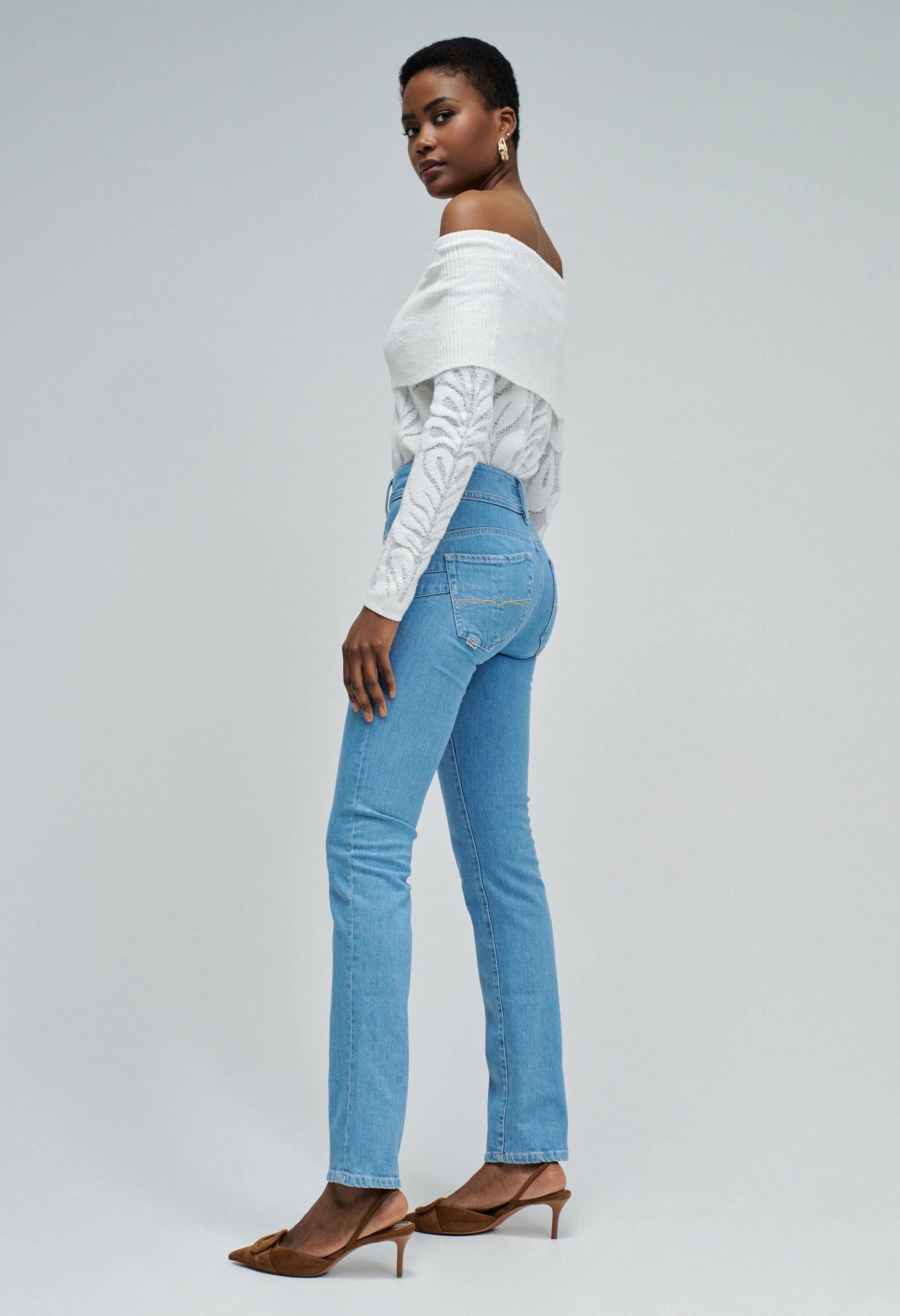 The Secret Push In jeans, with a medium waist and two buttons, incorporate an internal panel, specially designed to shape your waist with maximum comfort. The two side darts ensure the perfect fit. They are proof that elegance also wears jeans.