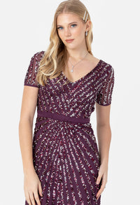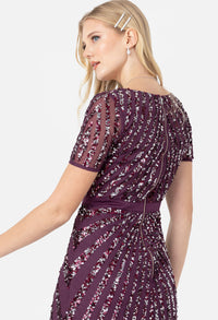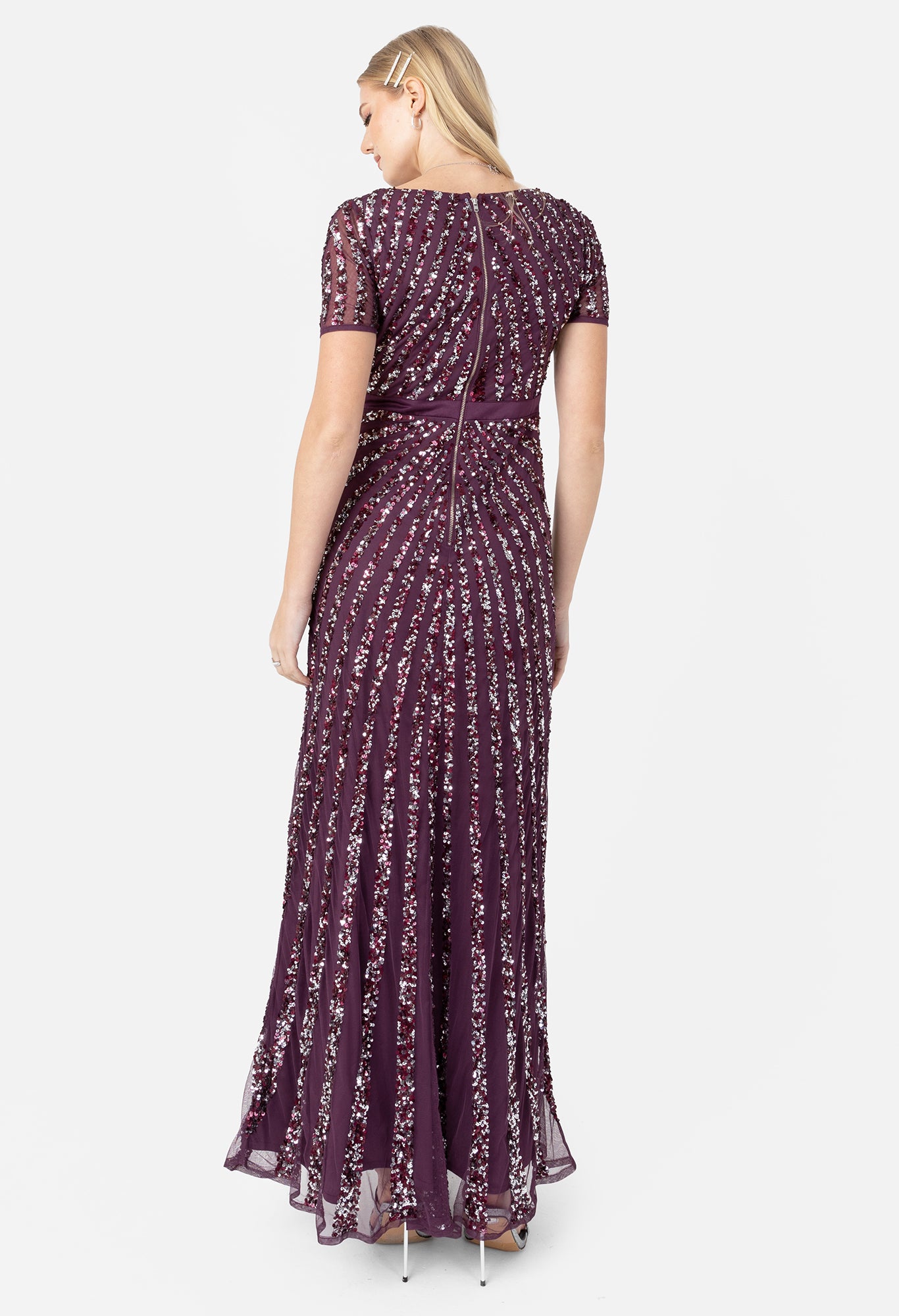 Made for evening balls and red carpet events this Berry gown will complement your figure with a fitted bodice and lightly flared skirt. Radiating from the waist are hand sewn silver sequin stripes that create an immersive feeling not just for yourself but everyone in the room. Pair this glam dress with wavy hair and strappy heels.