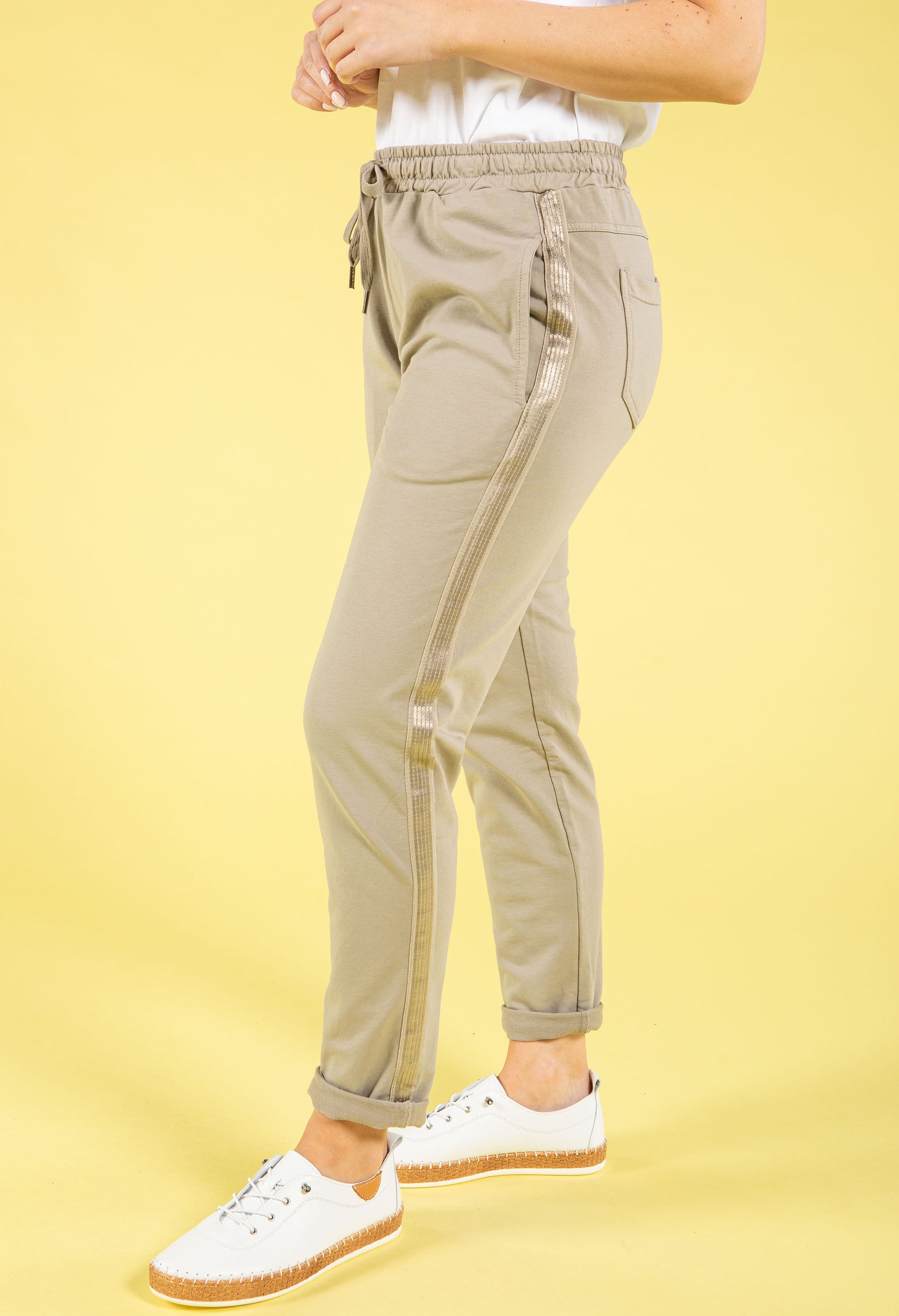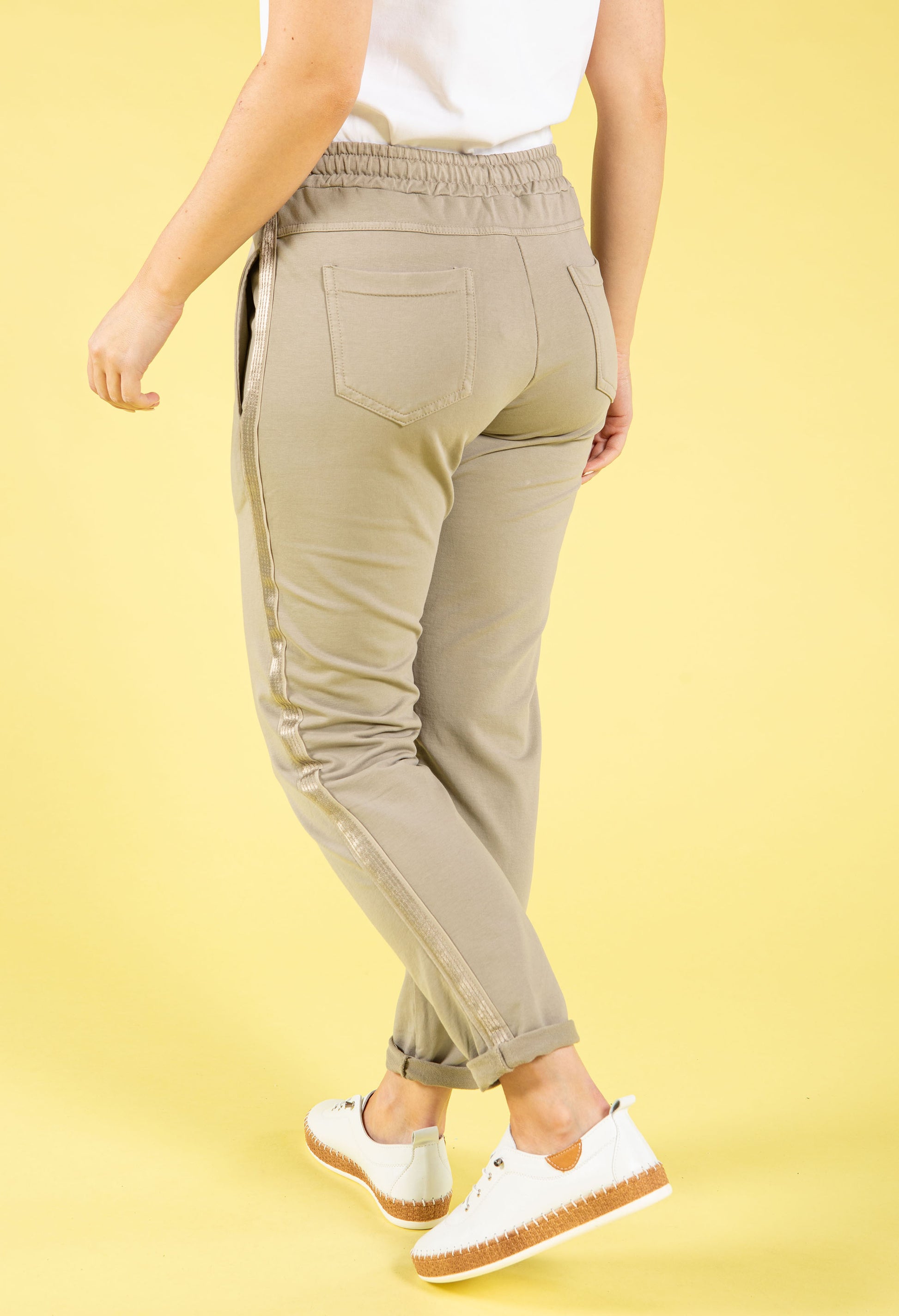 These Side Detail Joggers feature an elasticated waistband with a drawstring for a customizable fit. They include side and back open pockets along with a stylish side panel. Designed in a 7/8 length, they offer both comfort and a modern look.