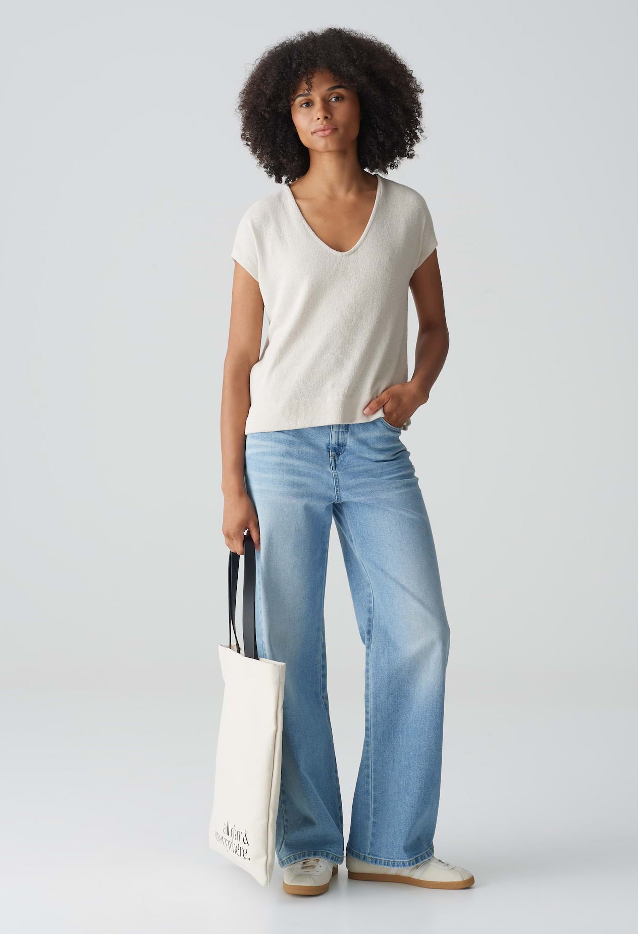 wide fit Boxy silhouette cropped length overcut short sleeve deep V-neck Back length approx. 55 cm for size 36 Model size 177 cm - wears size 36 Knitted look elasticated fabric Light transparency in a light colour tone Small slits in the sides Yoke in the back small back cut-out