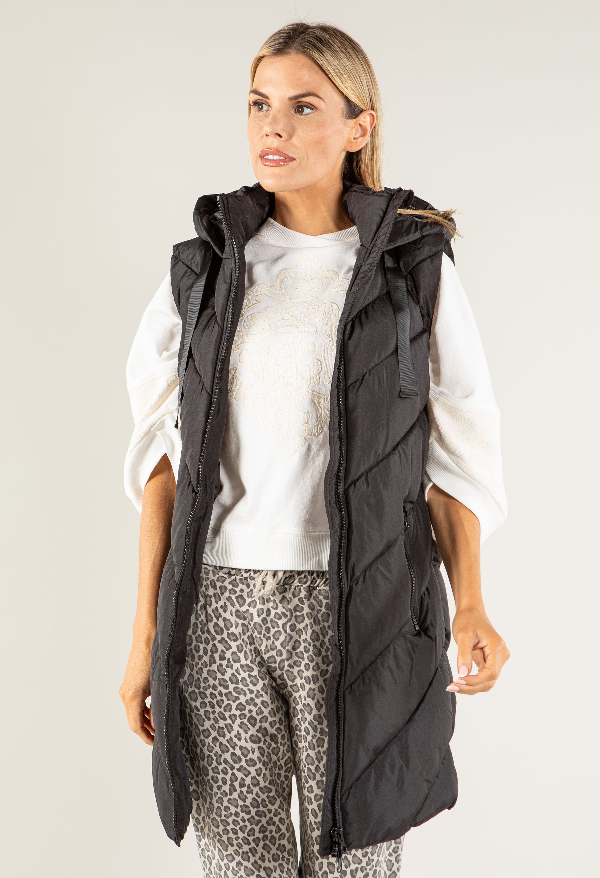 The Skylar Longline Puffer Gilet offers a hood with adjustable drawstrings, a sleeveless cut, and a secure zip closure. Designed with side pockets and a fully lined interior, it provides both functionality and warmth.