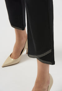 Introducing the Joseph Ribkoff trousers, designed for both casual and office settings. These slim-fit, cropped trousers feature a plain pattern and mid-rise waist, offering a modern yet timeless style. With functional zipper, buttons, and pockets, they're perfect for business and casual occasions. Elevate your wardrobe with these versatile and sophisticated bottoms, blending comfort and elegance effortlessly.