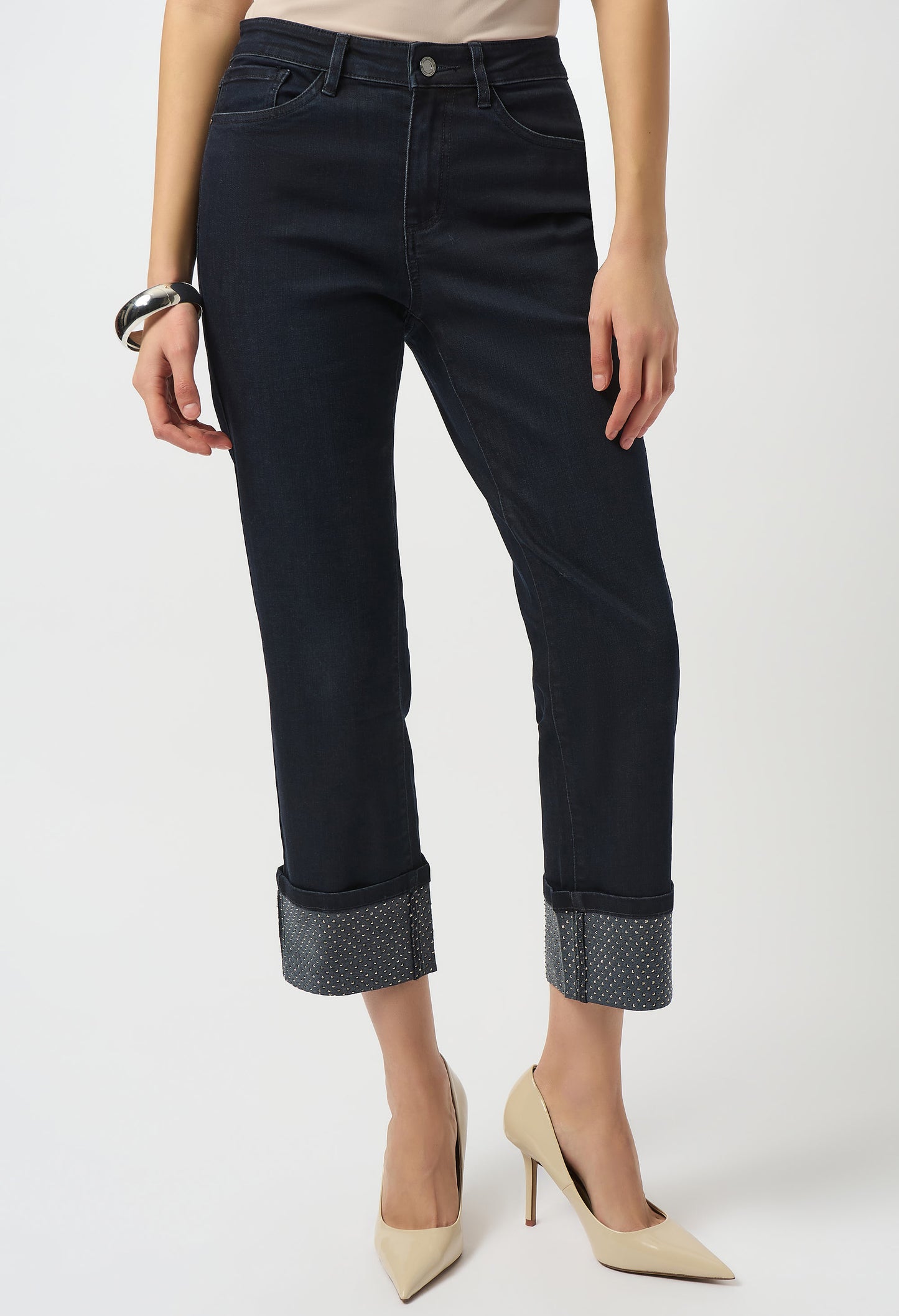 Introducing the Joseph Ribkoff slim-fit cropped jeans, perfect for both casual and office settings. These mid-rise trousers feature a plain pattern with elegant buttoned details, practical pockets, and an embellished hem. Combining business and casual styles, they offer versatility and comfort, making them a must-have addition to your wardrobe.
