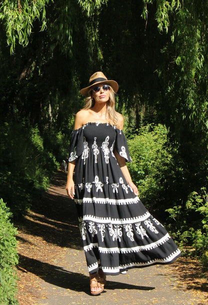 Discover the perfect combination of comfort and style with our Maxi Length Smocking Bodice Floral Dress, featuring a tiered hemline and short angel sleeves for a flattering look.