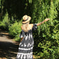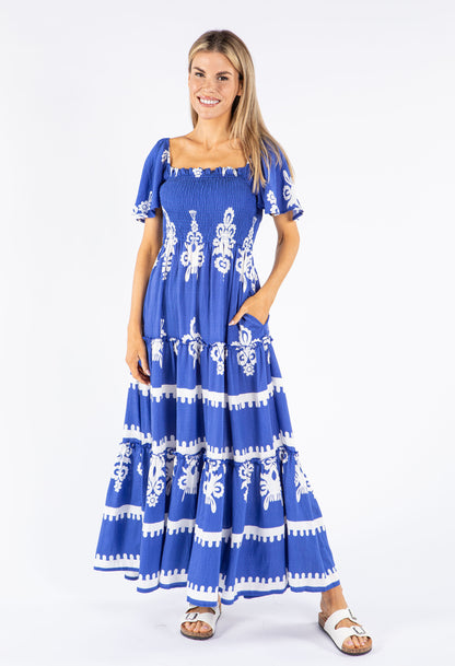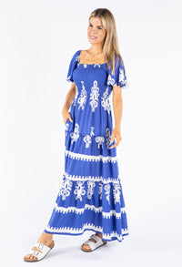 Discover the perfect combination of comfort and style with our Maxi Length Smocking Bodice Floral Dress, featuring a tiered hemline and short angel sleeves for a flattering look.